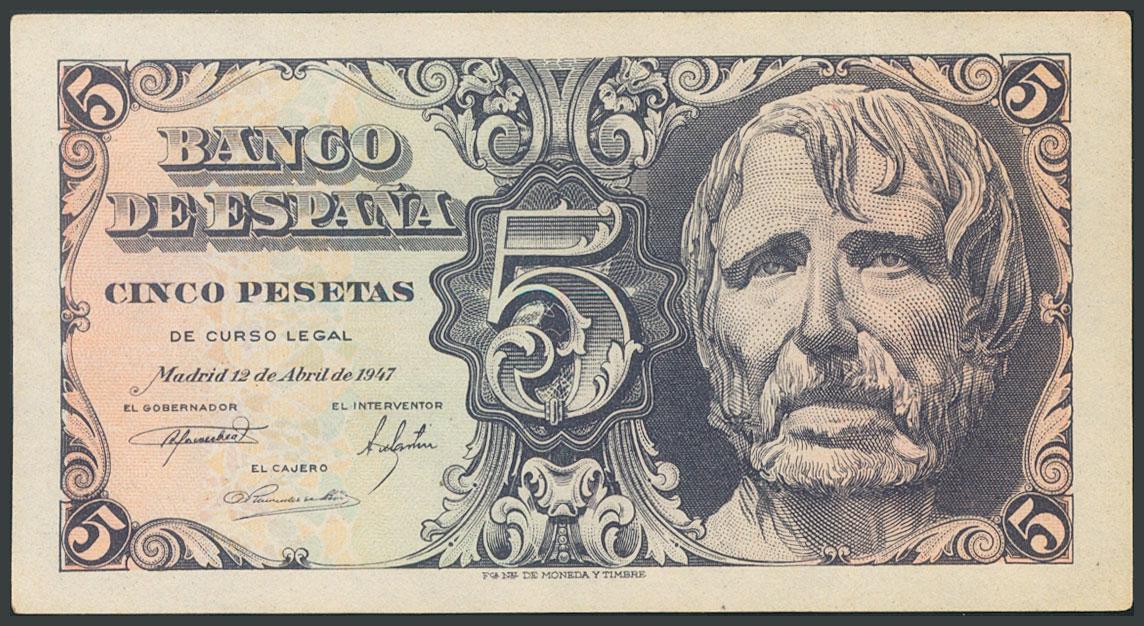 5 Pesetas. April 12, 1947. Series A. (Edifil 2017: 454a). AU.