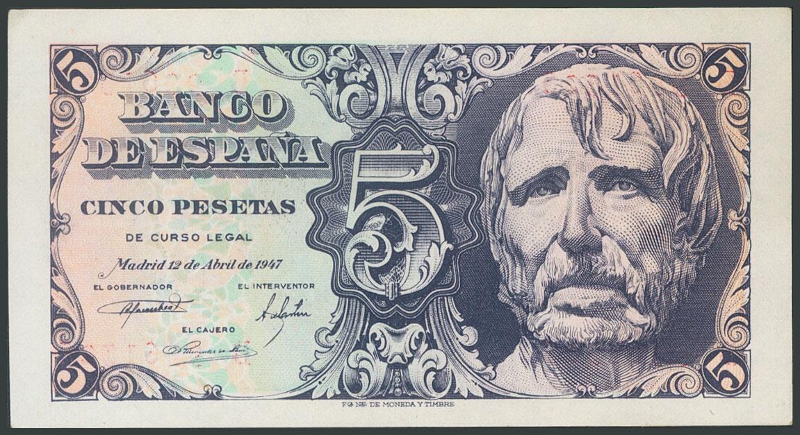5 Pesetas. April 12, 1947. Series B. (Edifil 2017: 454a). Original sizing. UNC.