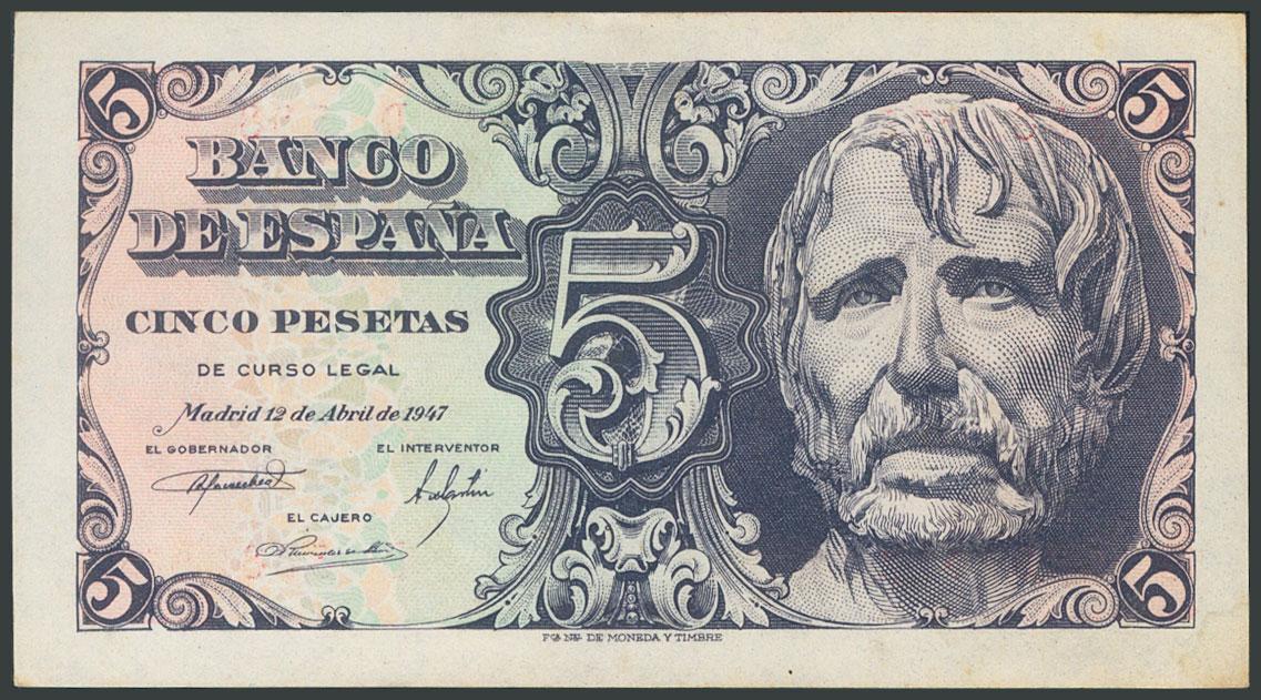 5 Pesetas. April 12, 1947. Series D. (Edifil 2017: 454a). AU.
