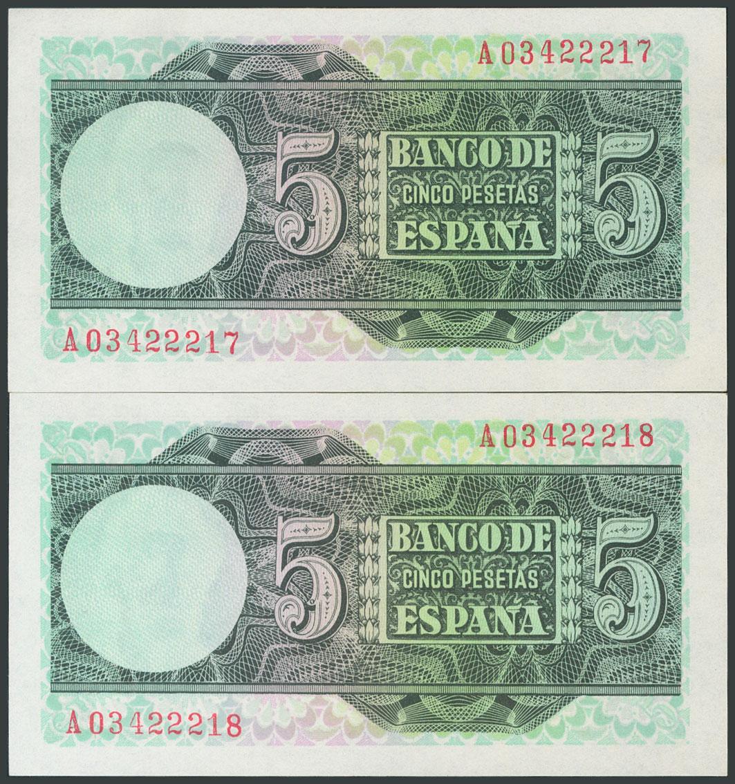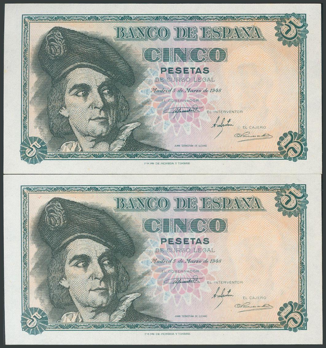 5 Pesetas. March 5, 1948. Correlative pair. Series A. (Edifil 2017: 455a). Original sizing. UNC.