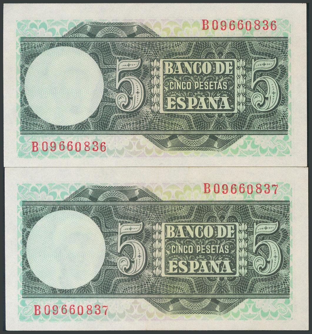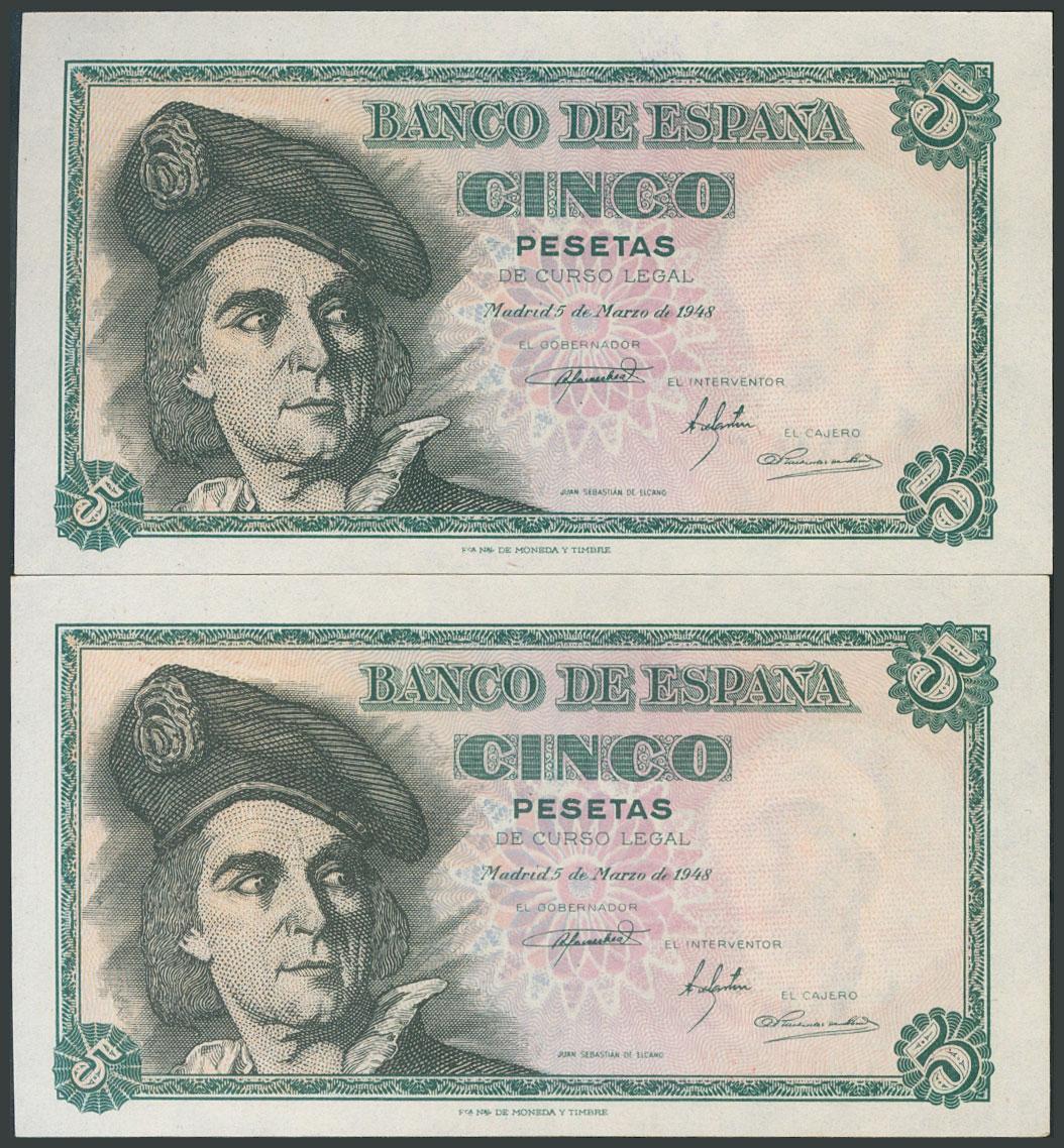 5 Pesetas. March 5, 1948. Correlative pair. Series B. (Edifil 2017: 455a). Original sizing. UNC.