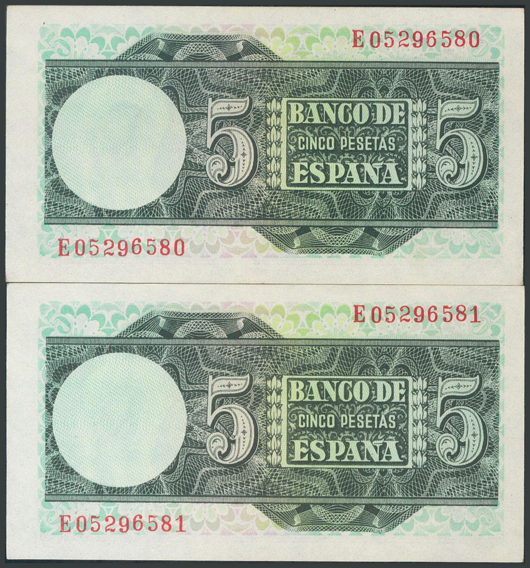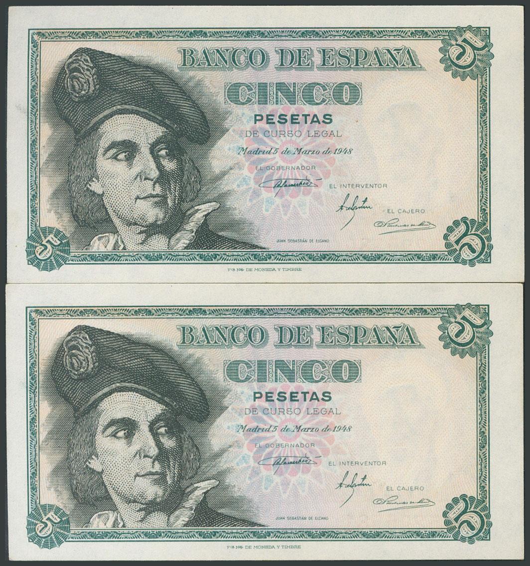 5 Pesetas. March 5, 1948. Correlative pair. Series E. (Edifil 2017: 455a). Original sizing. UNC.