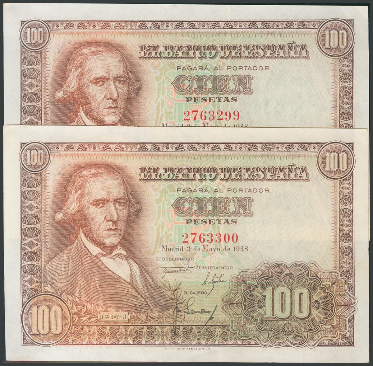 100 Pesetas. May 2, 1948. Correlative pair. No serie. (Edifil 2017: 456). Both bills present their original size. UNC/ AU.
