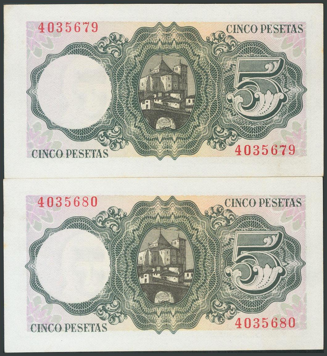 5 Pesetas. August 16, 1951. Correlative couple. No serie. (Edifil 2017: 459). Unusual and original sizing, imperceptible point of time. UNC.
