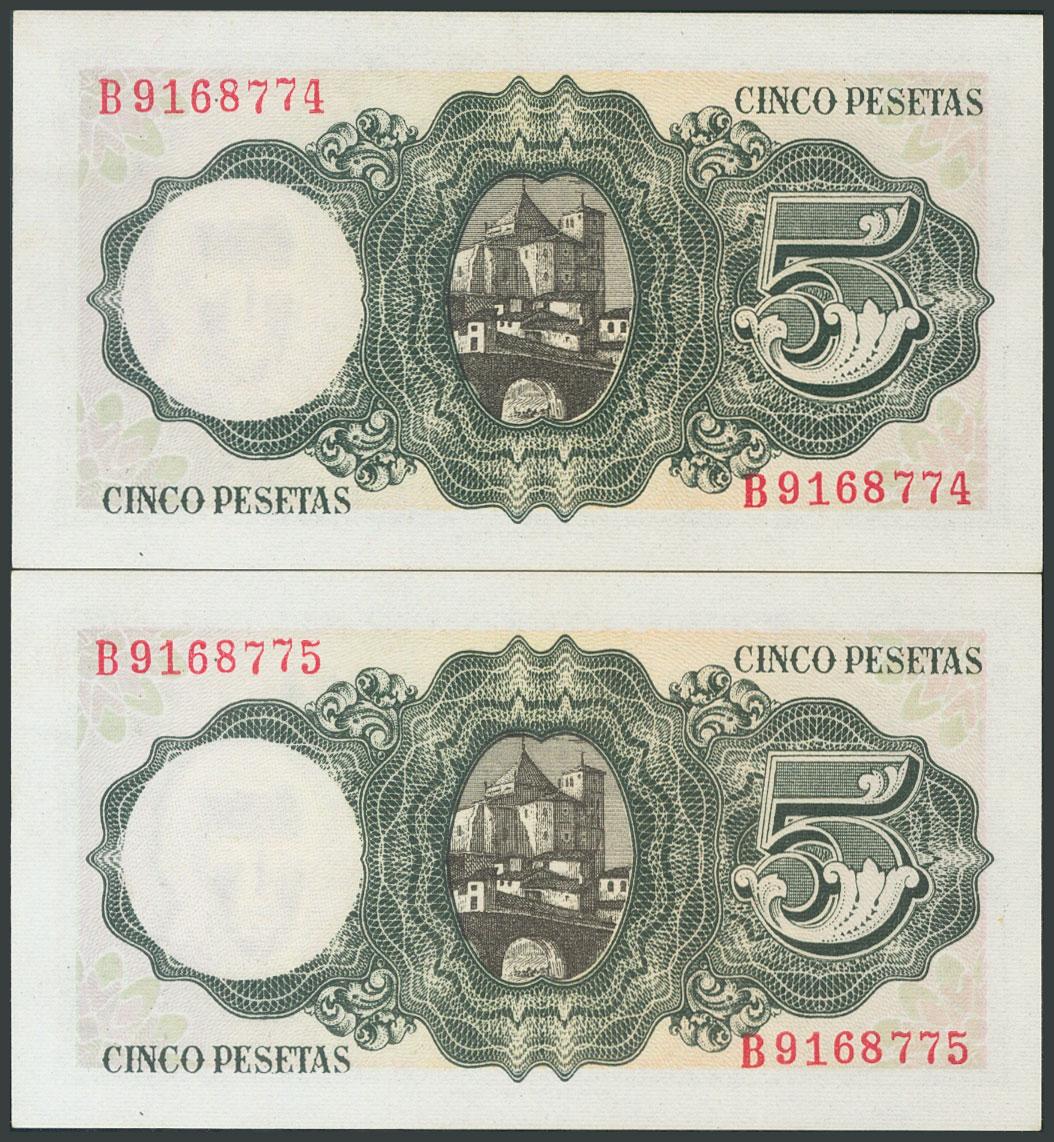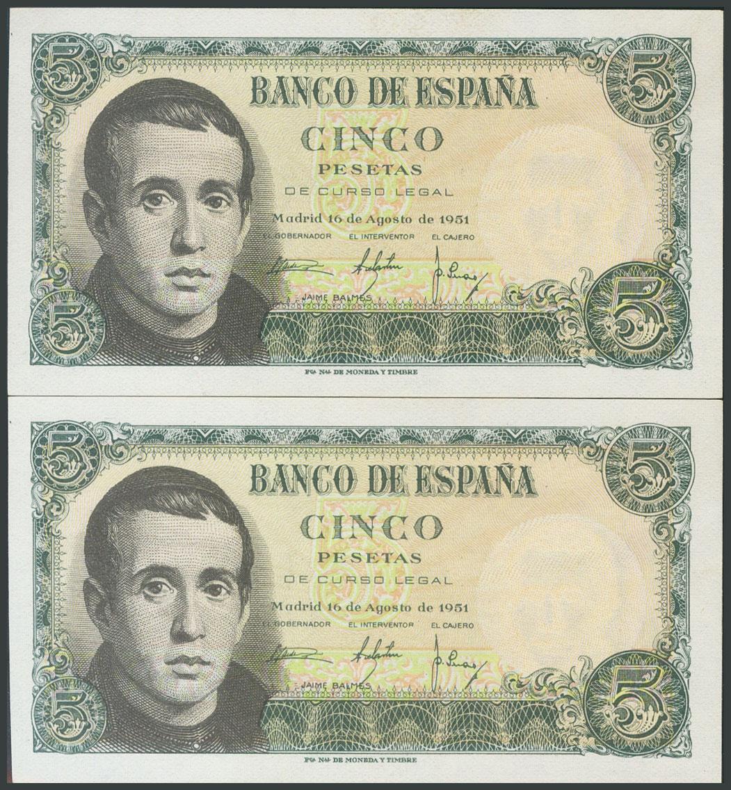 5 Pesetas. August 16, 1951. Correlative couple. Series B. (Edifil 2017: 459a). Original sizing. UNC.