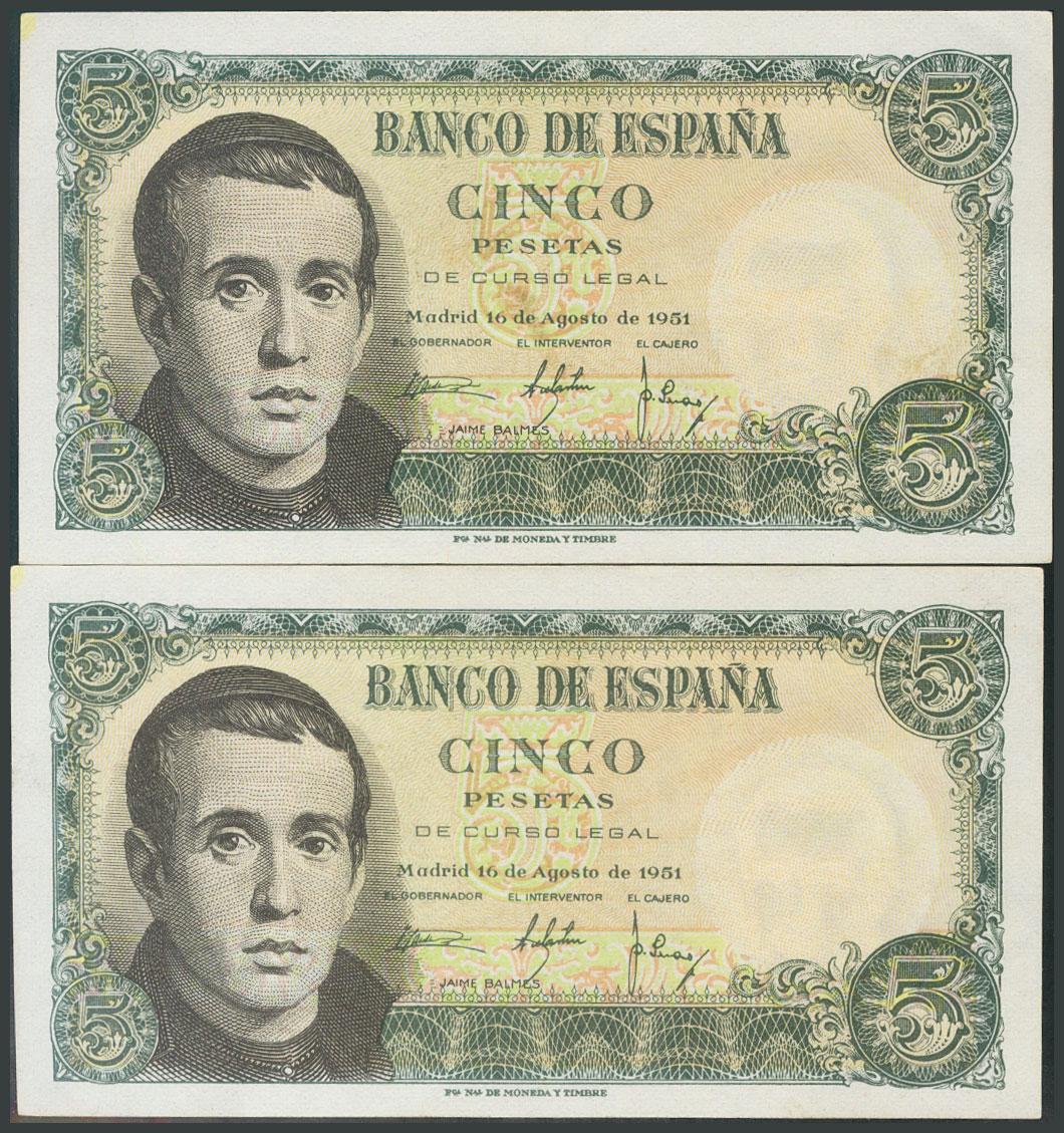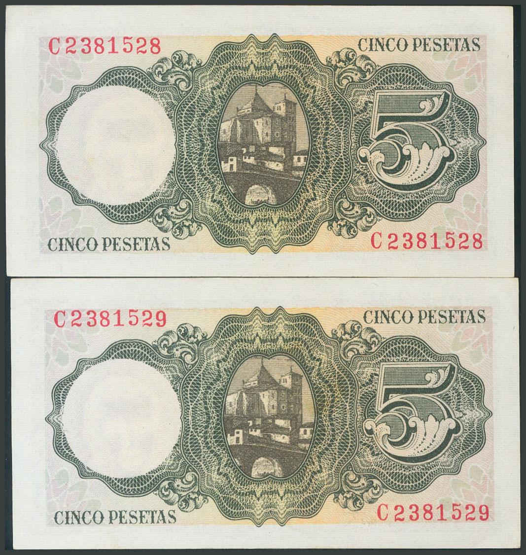 5 Pesetas. August 16, 1951. Correlative couple. Series C. (Edifil 2017: 459a). Original sizing. UNC.