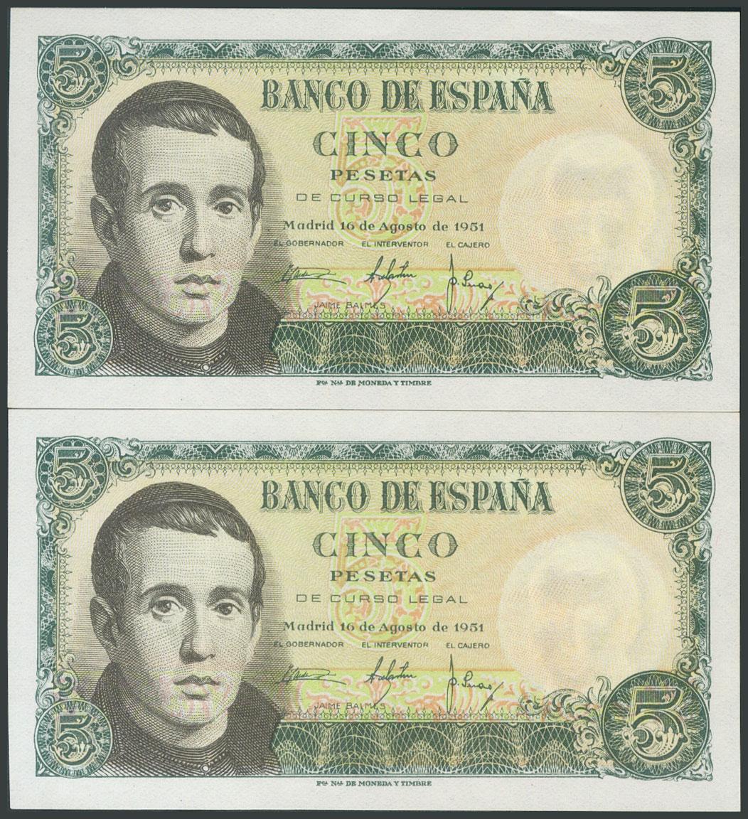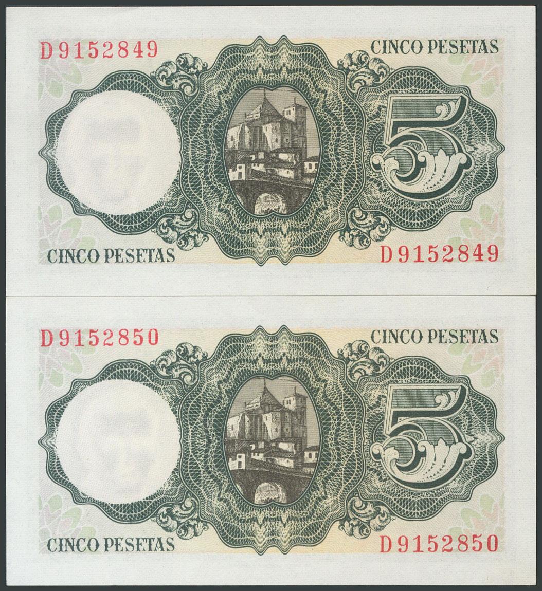 English 5 Pesetas. August 16, 1951. Correlative couple. Series D. (Edifil 2017: 459a). Original sizing. UNC.