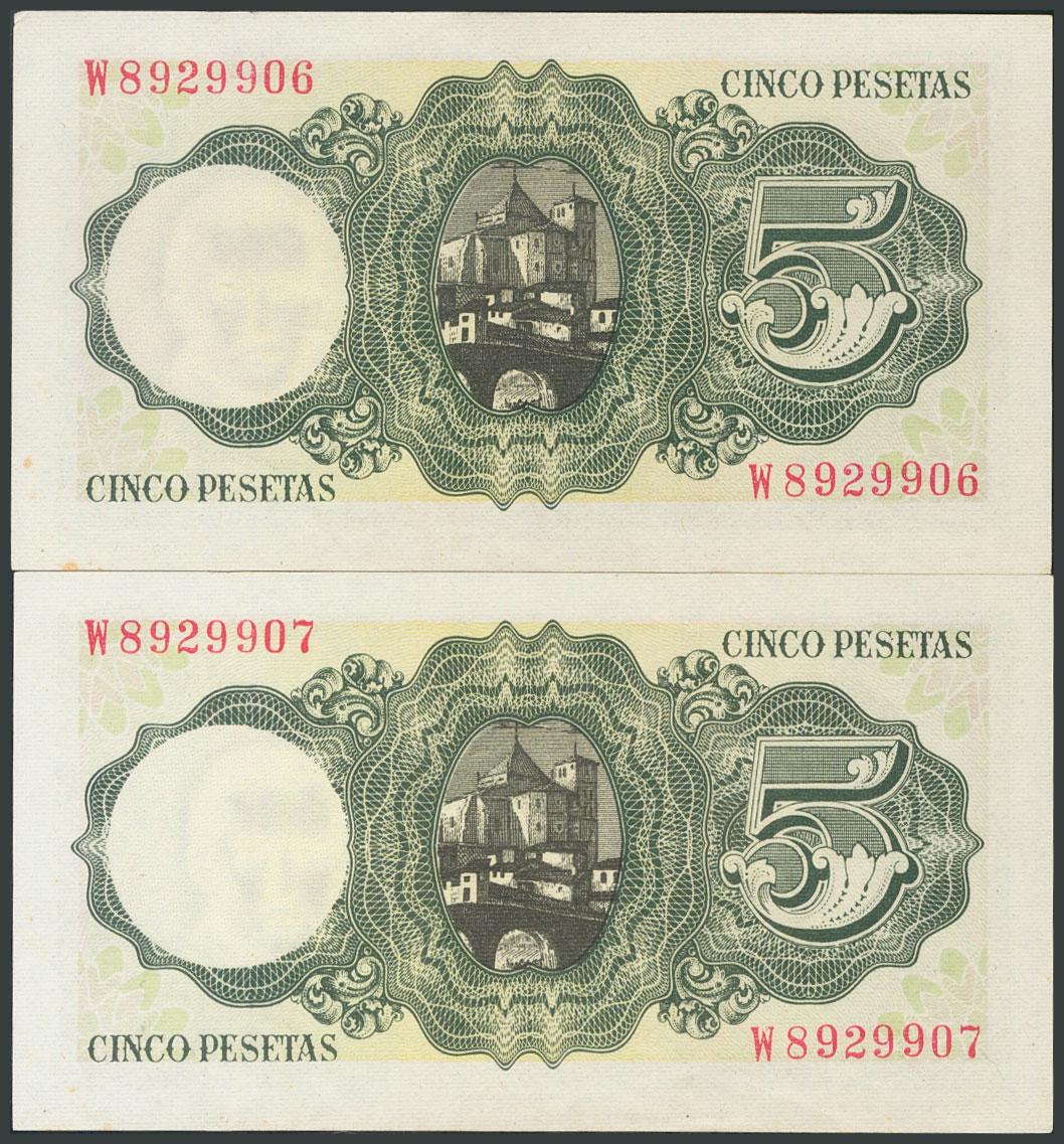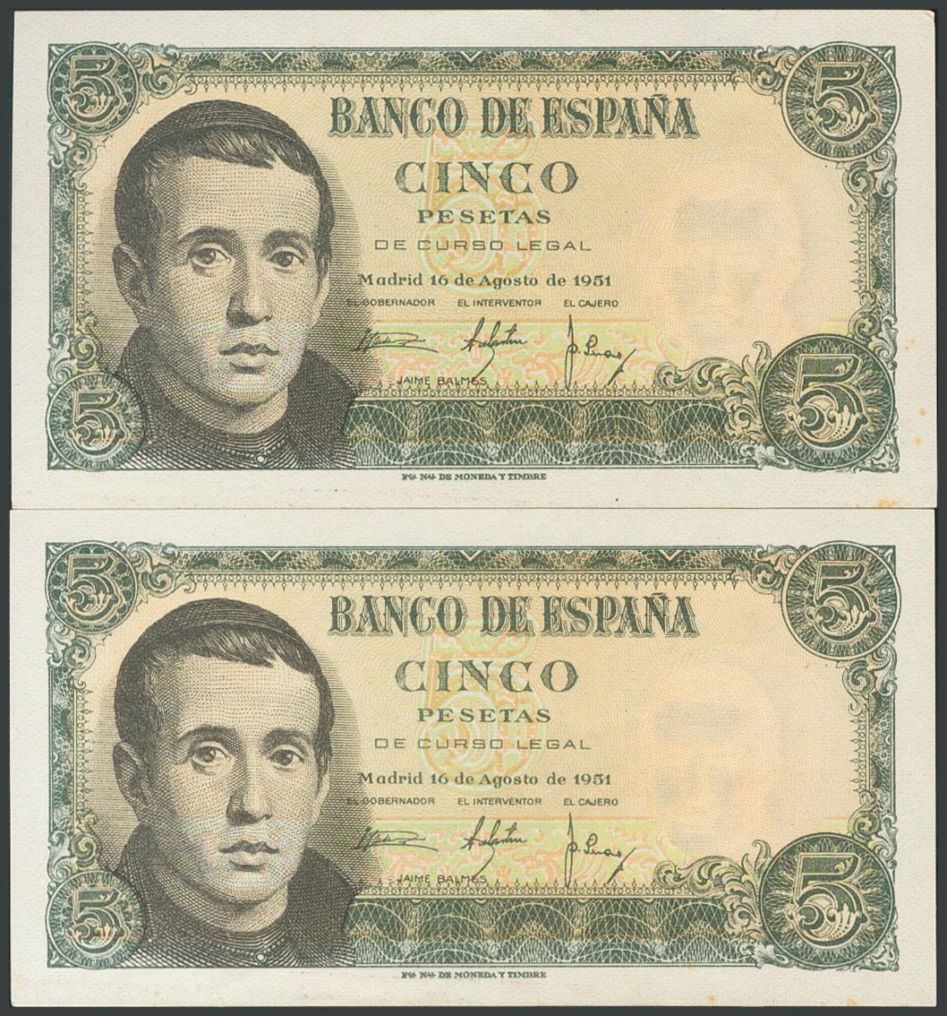 5 Pesetas. August 16, 1951. Correlative couple. Series W. (Edifil 2017: 459a). Original sizing, some dots of time. UNC.