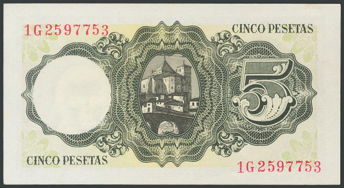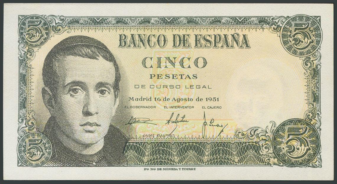 English 5 Pesetas. August 16, 1951. Series 1G. (Edifil 2017: 459a). Original sizing. UNC.
