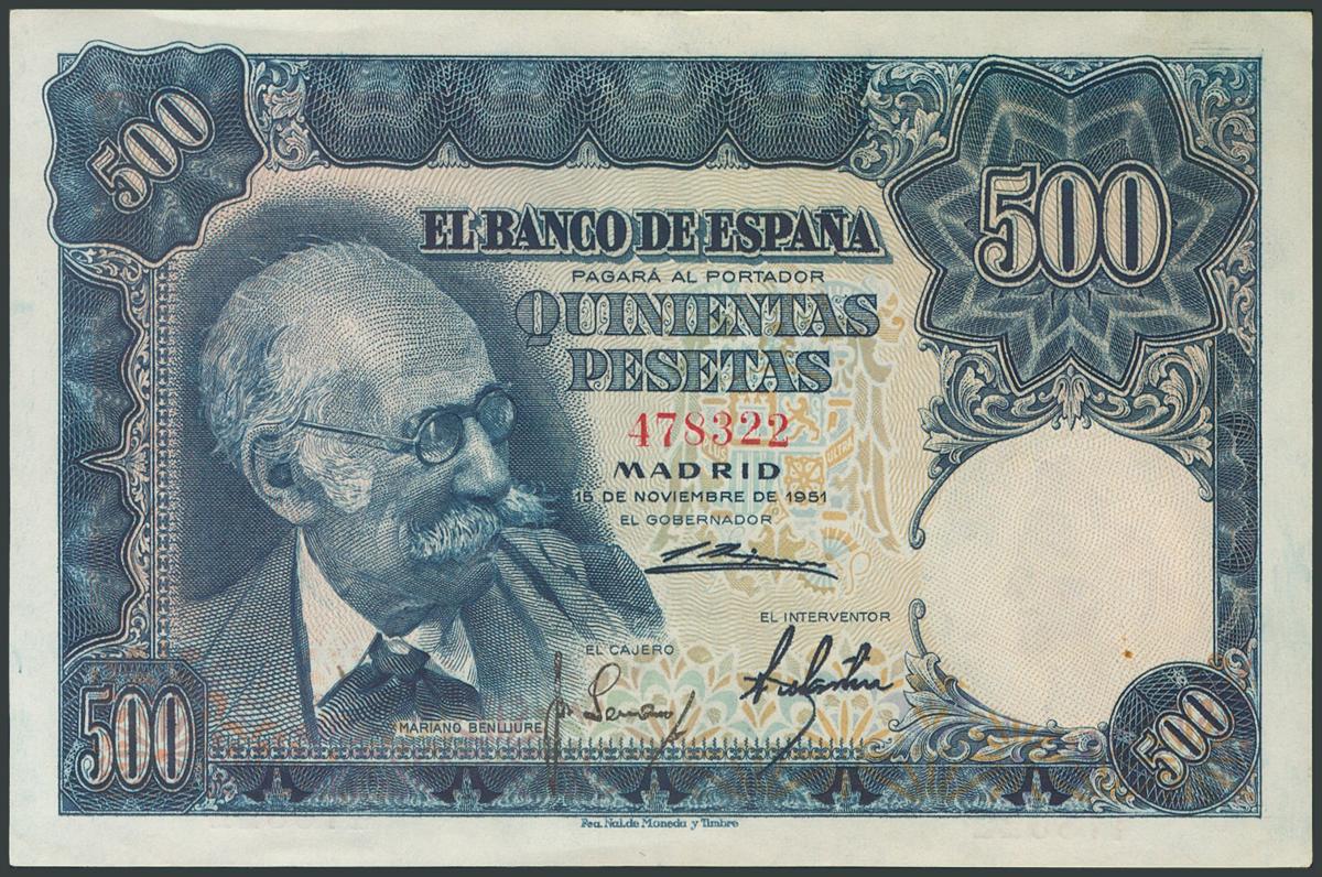 500 pesetas. November 15, 1951. Without series. (Edifil 2017: 460). It retains most of its original size, little dots of time. AU.