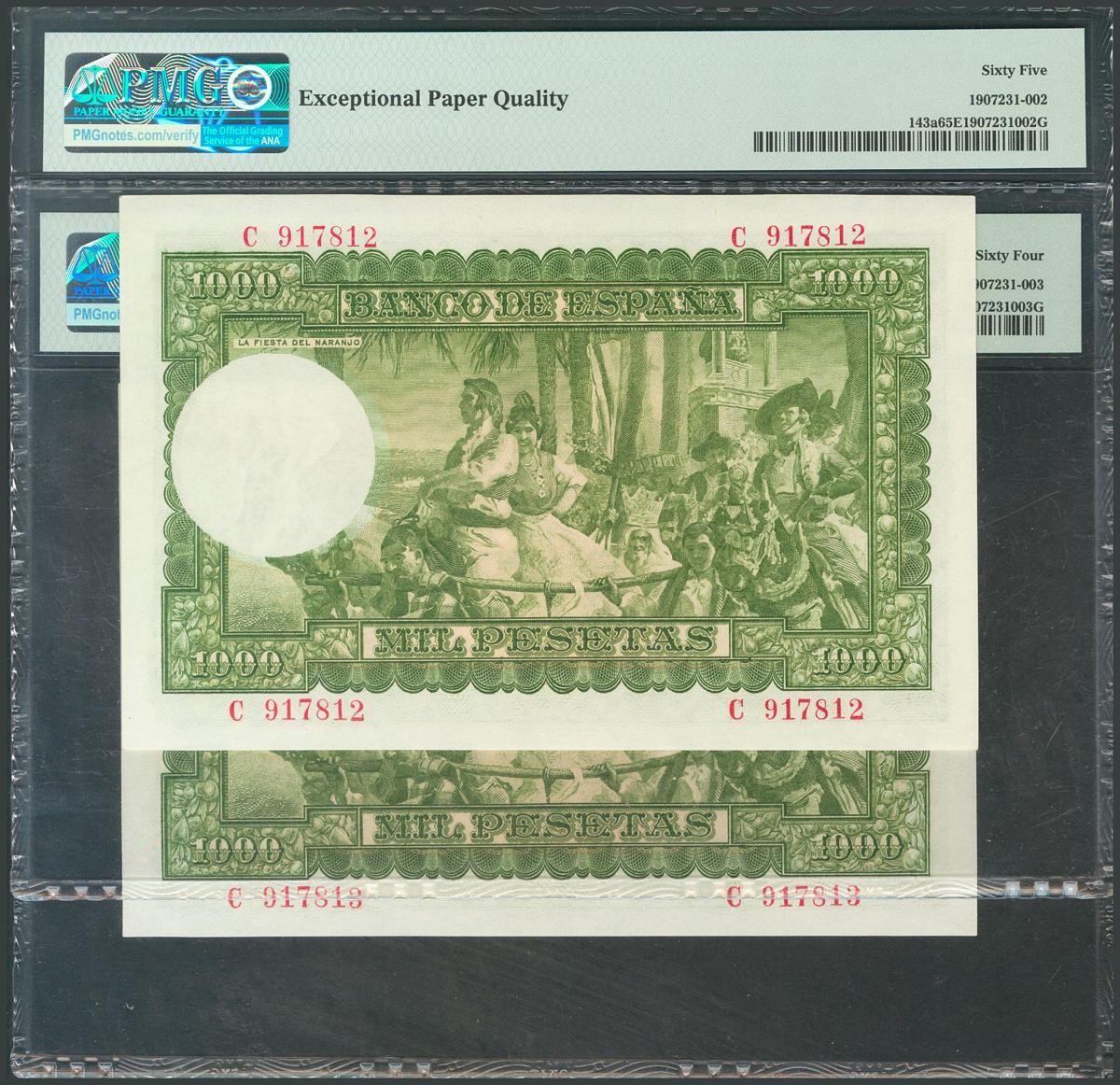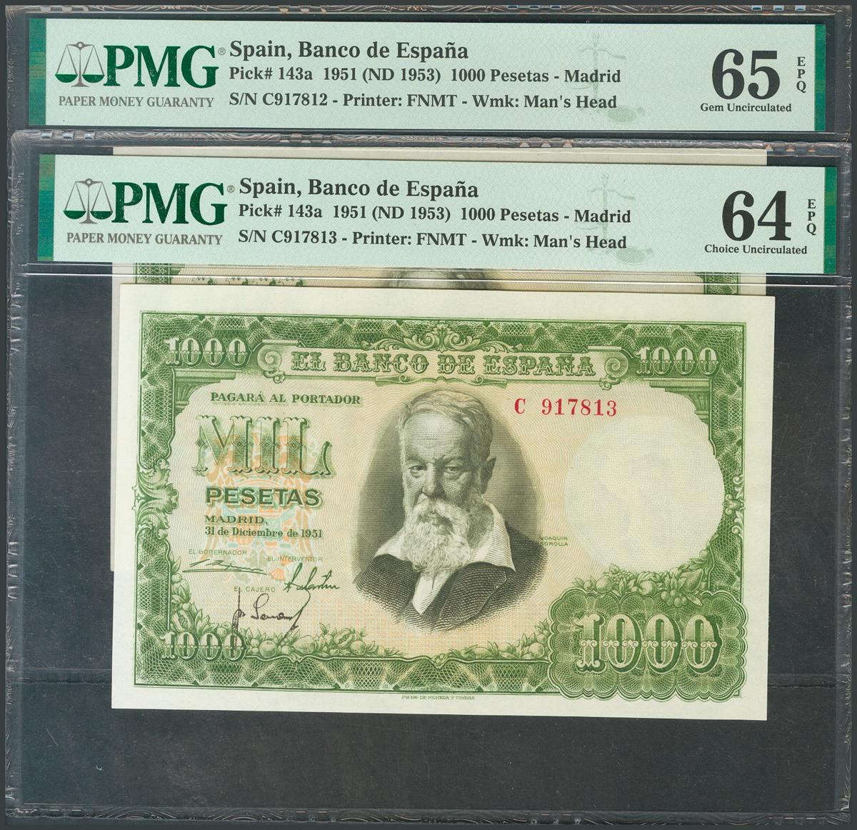 1000 Pesetas. December 31, 1951. Correlative couple. Series C, last series issued. (Edifil 2017: 463a). It retains all its original size, very rare as well. PMG64EPQ / 65EPQ package. UNC.