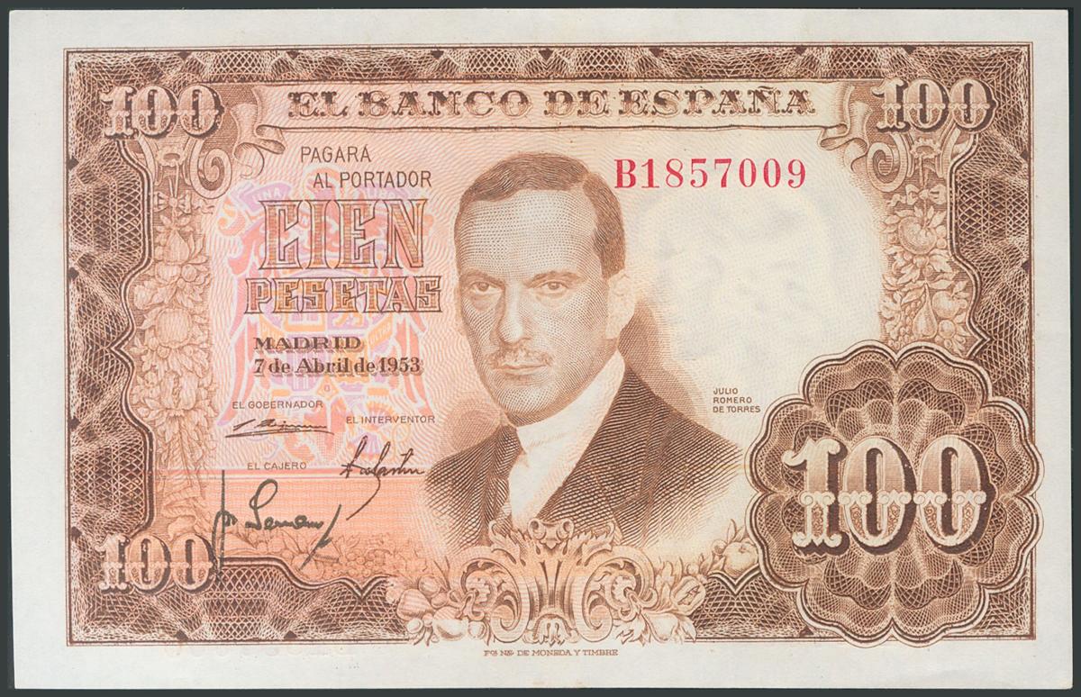 100 Pesetas. April 7, 1953. Series B. (Edifil 2017: 464b). Original sizing. UNC.
