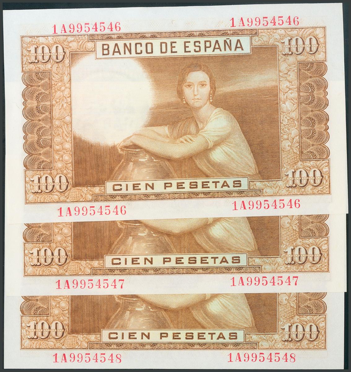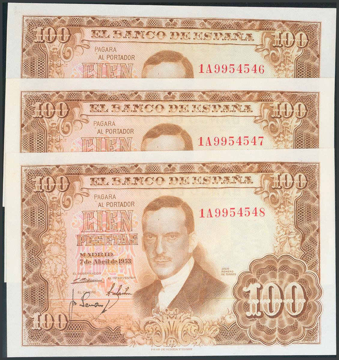 100 Pesetas. April 7, 1953. Correlative trio. Series 1A. (Edifil 2017: 464c). Original sizing. UNC.
