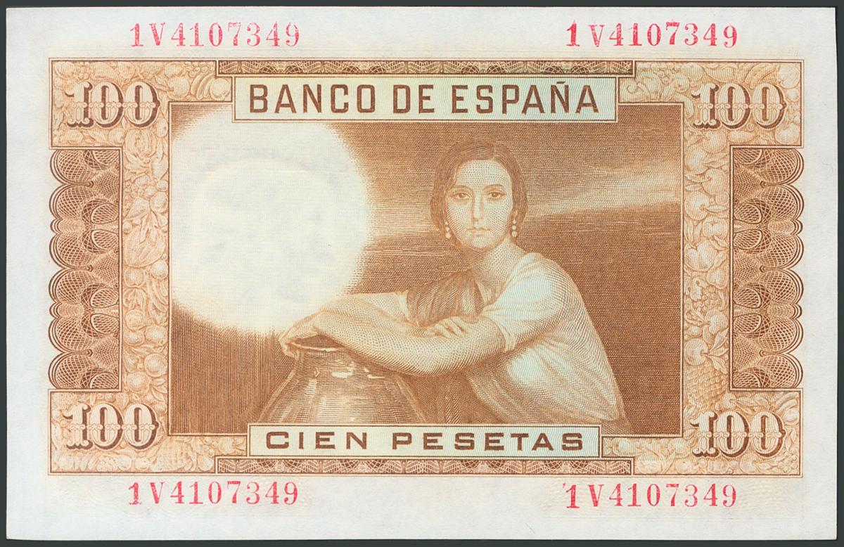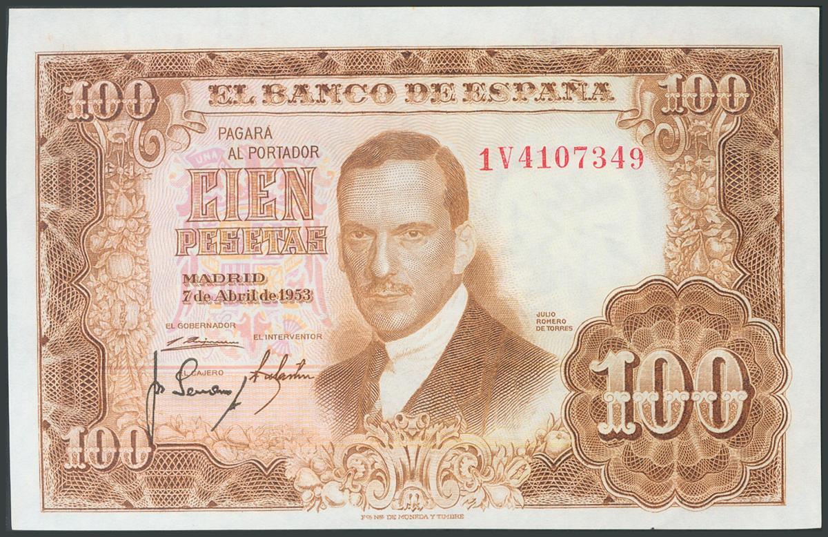English 100 Pesetas. April 7, 1953. Series 1V. (Edifil 2017: 464c). Original sizing. UNC.