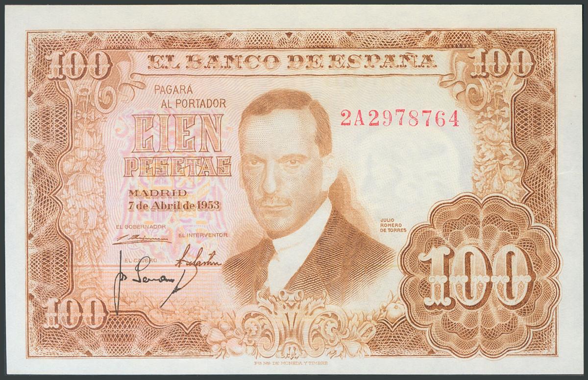 100 Pesetas. April 7, 1953. Series 2A. (Edifil 2017: 464c). Original sizing. UNC.