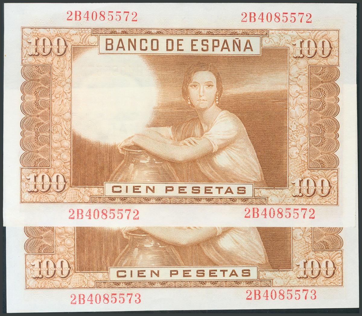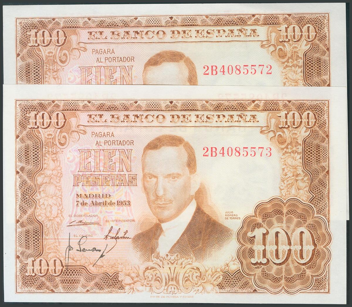 English 100 Pesetas. April 7, 1953. Correlative couple. Series 2B. (Edifil 2017: 464c). Original sizing. UNC.