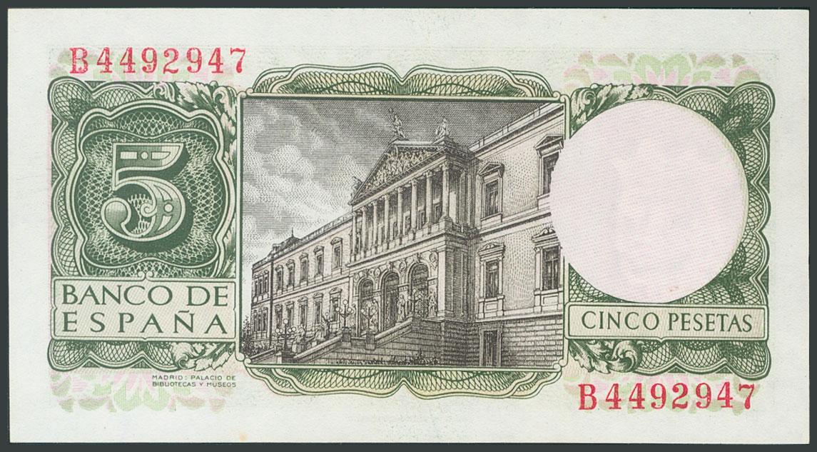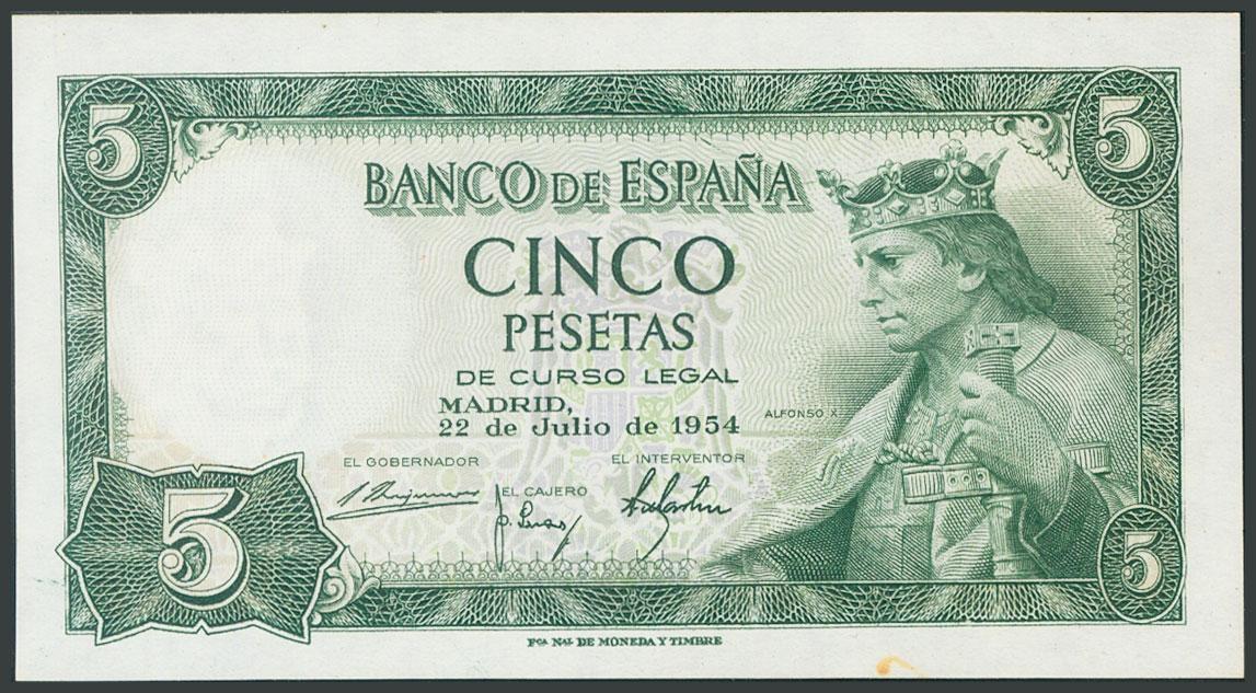 5 Pesetas. July 22, 1954. Series B. (Edifil 2017: 466a). Original sizing and spot of stain at the bottom. AU.