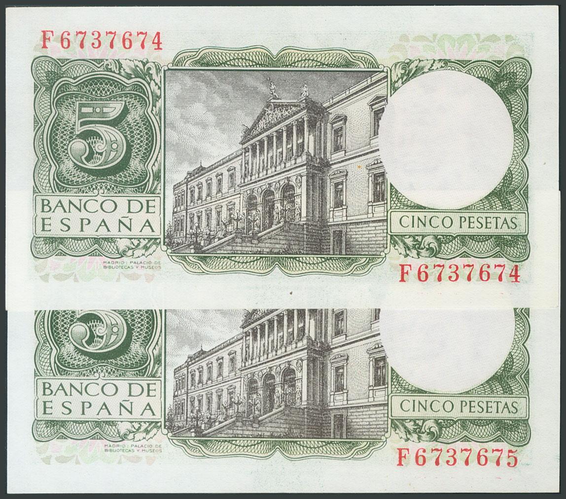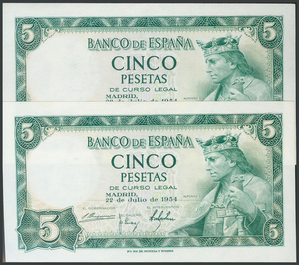 5 Pesetas. July 22, 1954. Correlative couple. Series F. (Edifil 2017: 466a). Original sizing. UNC.