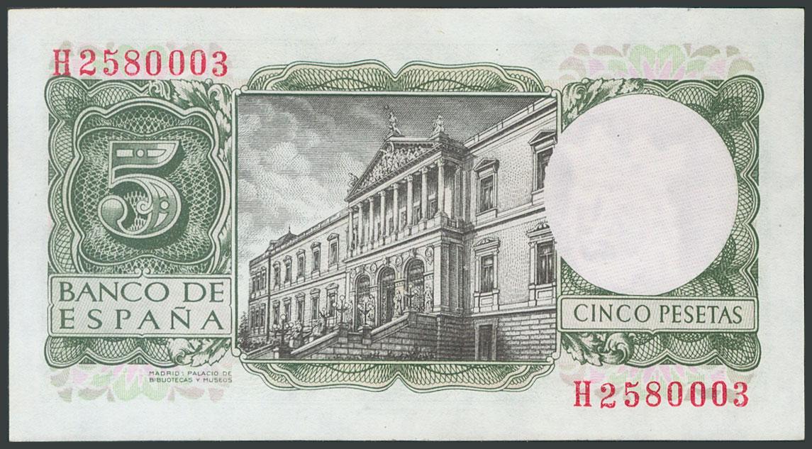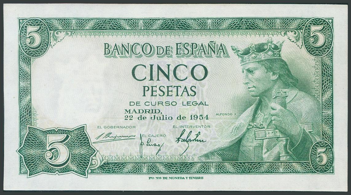 5 Pesetas. July 22, 1954. Series H. (Edifil 2017: 466a). It preserves a large part of the original size. UNC.