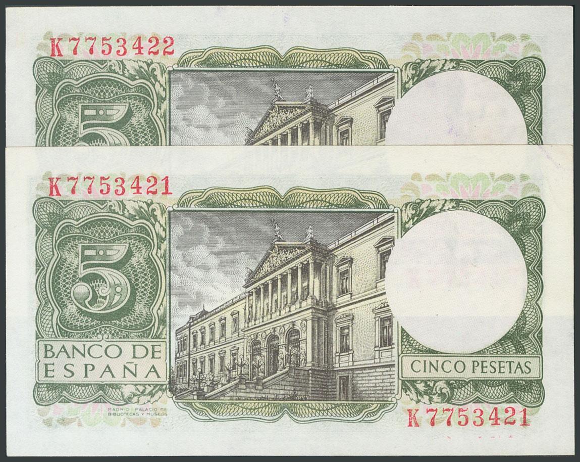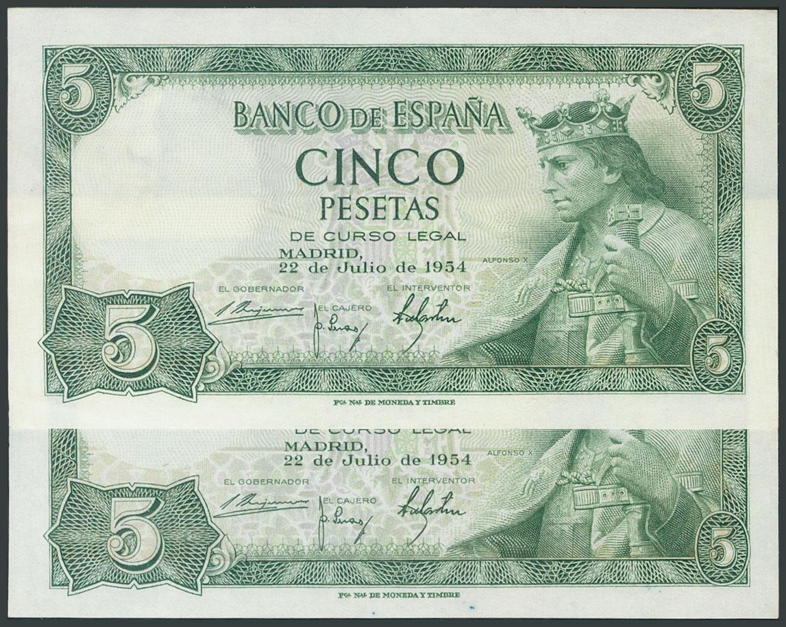 5 Pesetas. July 22, 1954. Correlative couple. Series K. (Edifil 2017: 466a). Original sizing. AU.