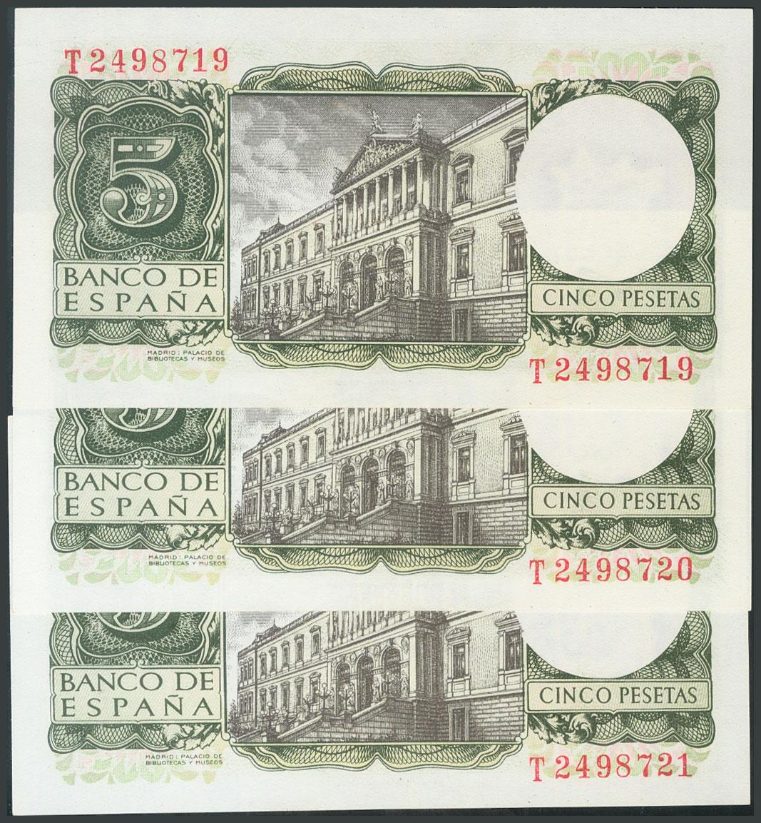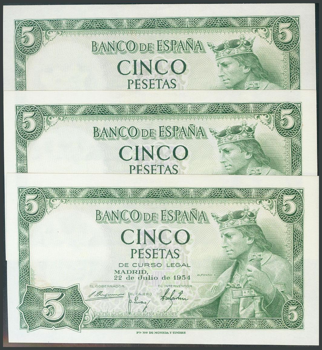 5 Pesetas. July 22, 1954. Correlative trio. Series T. (Edifil 2017: 466a). Original sizing. UNC.
