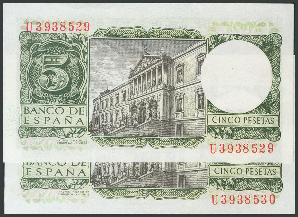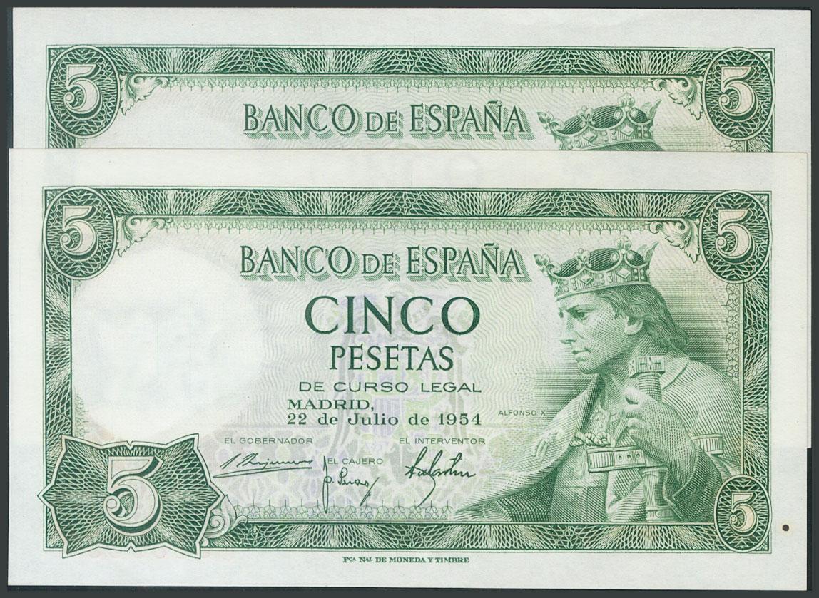 5 Pesetas. July 22, 1954. Correlative couple. Series U. (Edifil 2017: 466a). Original sizing. UNC.