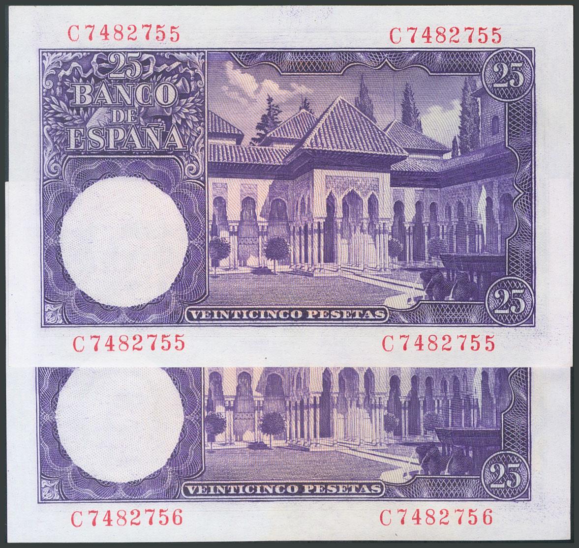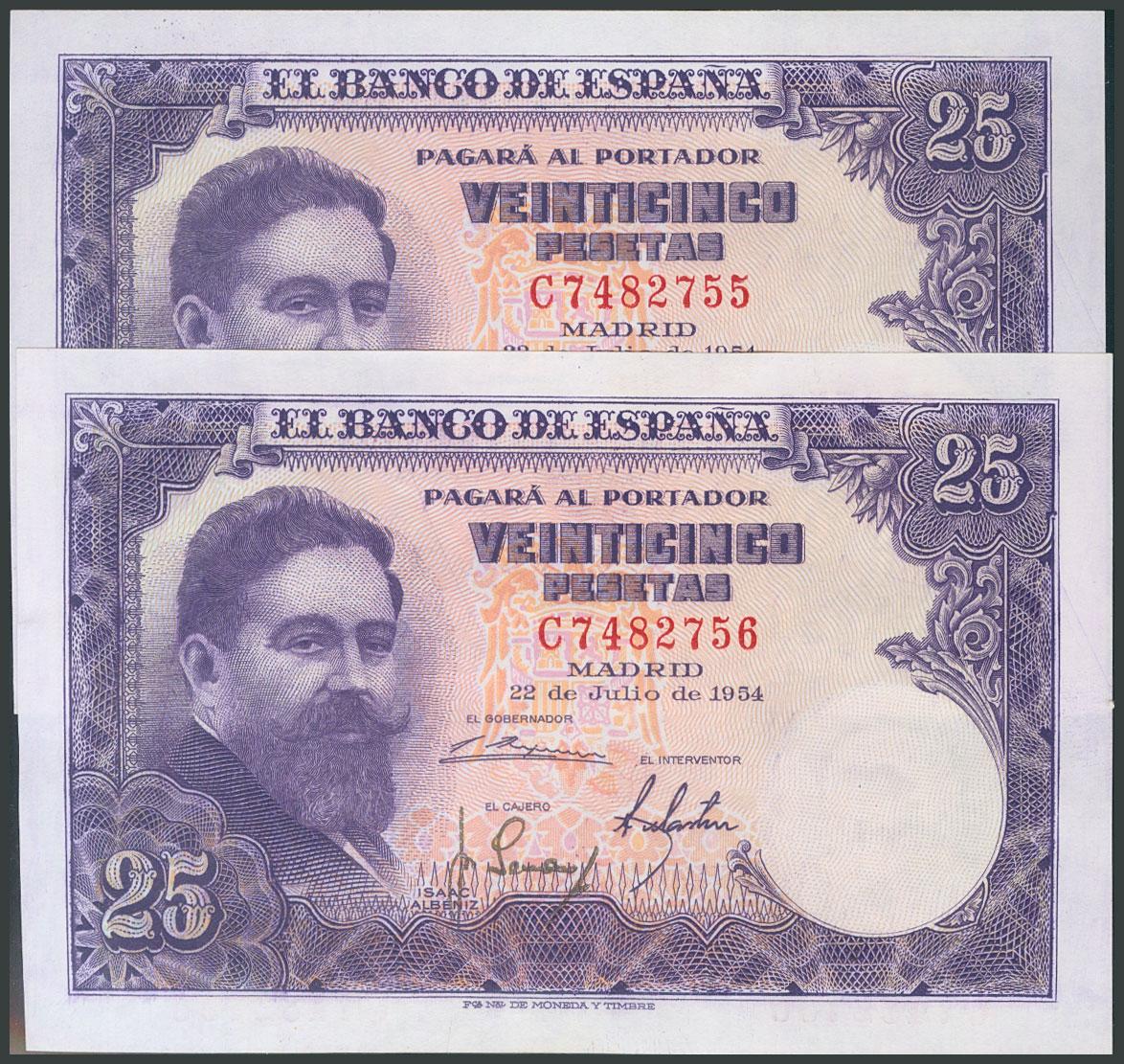 English 25 Pesetas. July 22, 1954. Correlative couple. Series C. (Edifil 2017: 467a). Original sizing. UNC.
