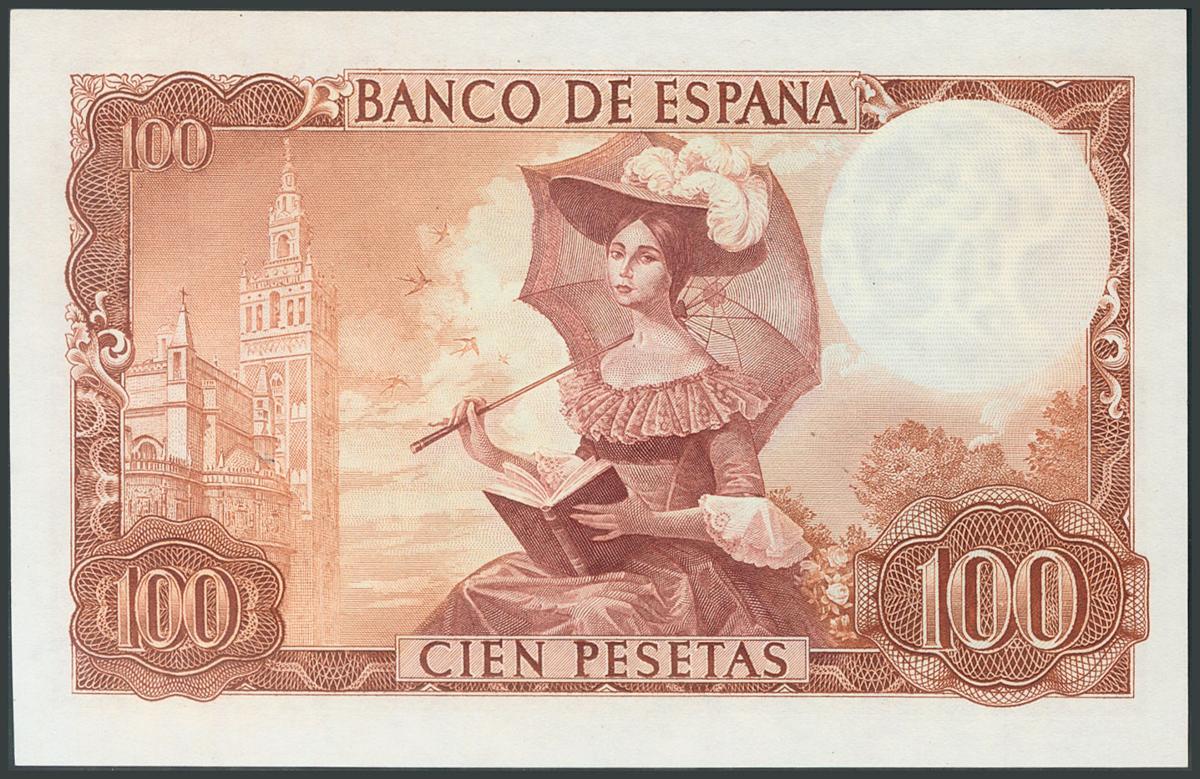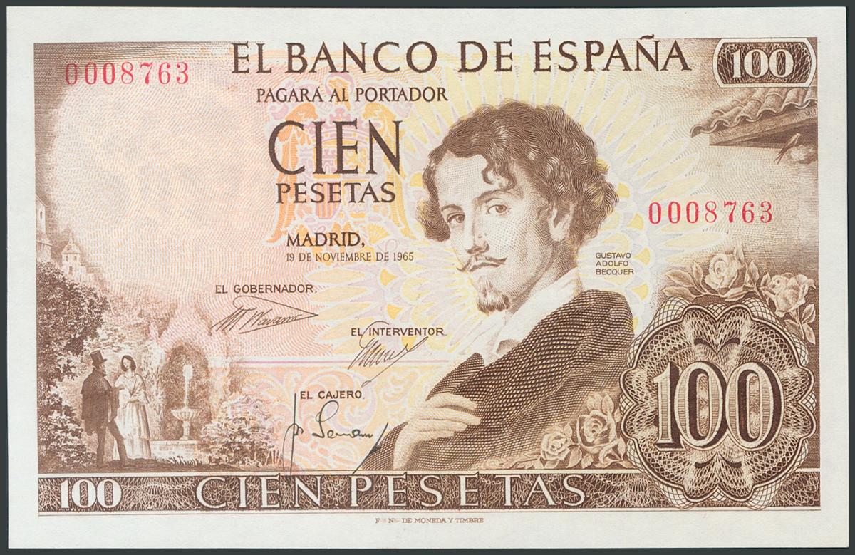 100 Pesetas. November 19, 1965. No series and very low numbering. (Edifil 2017: 470). Original sizing. UNC.