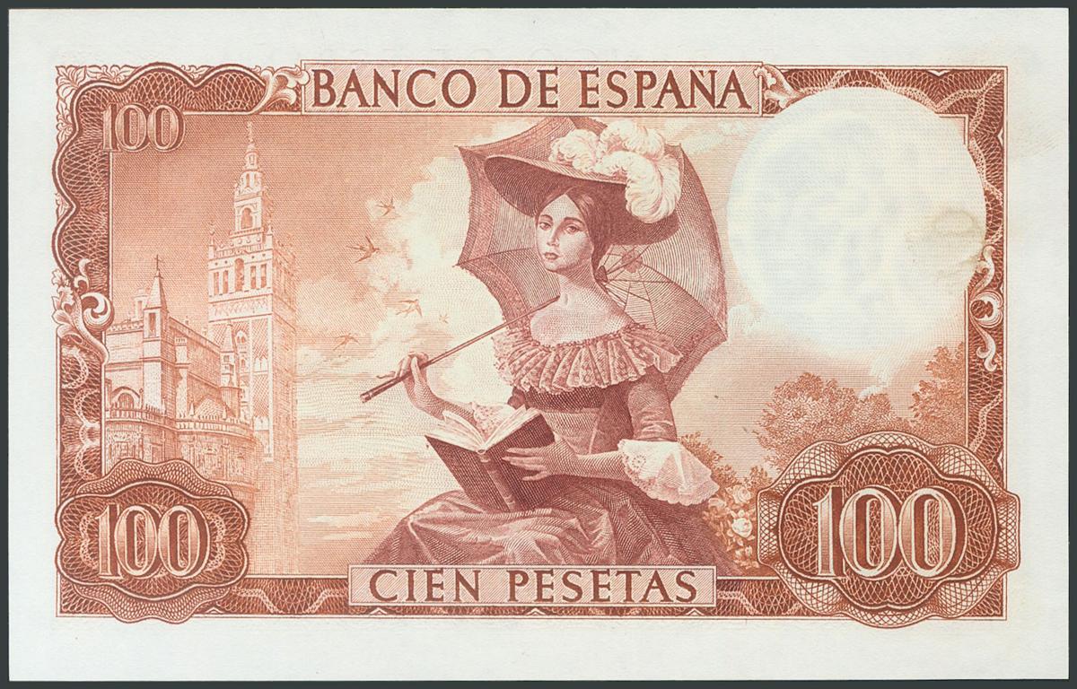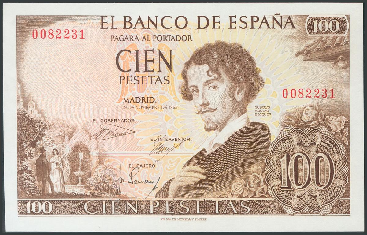 100 Pesetas. November 19, 1965. No series and very low numbering. (Edifil 2017: 470). Original sizing. UNC.