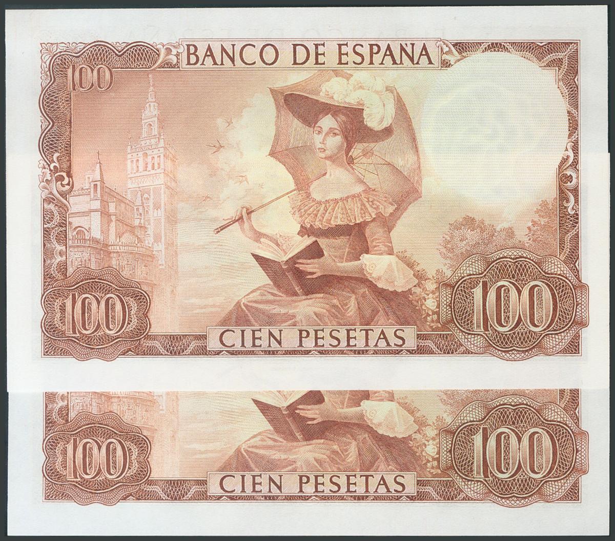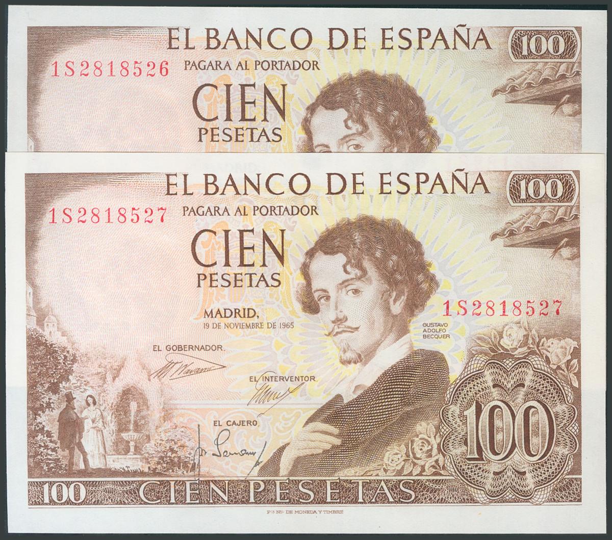 100 Pesetas. November 19, 1965. Correlative couple. Series 1S. (Edifil 2017: 470a). Original sizing. UNC.