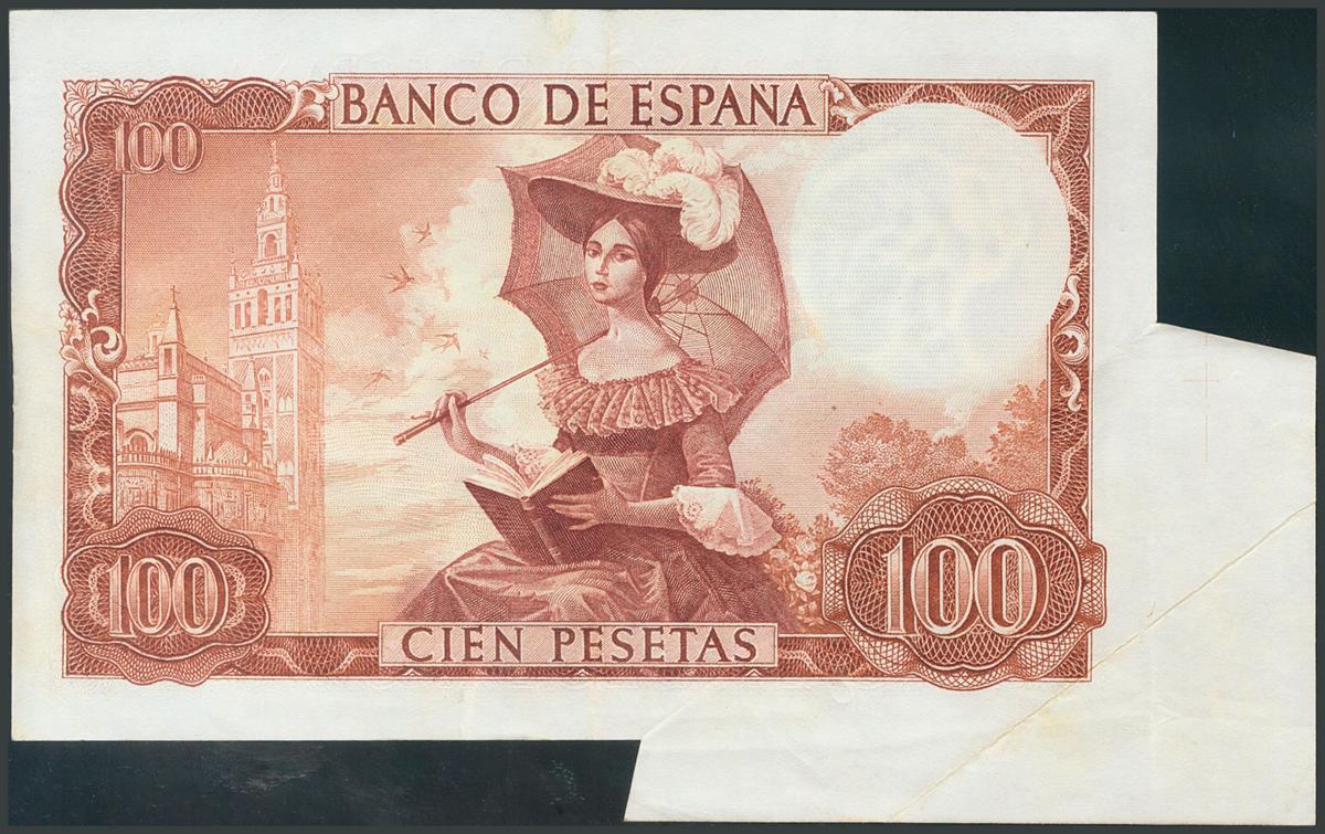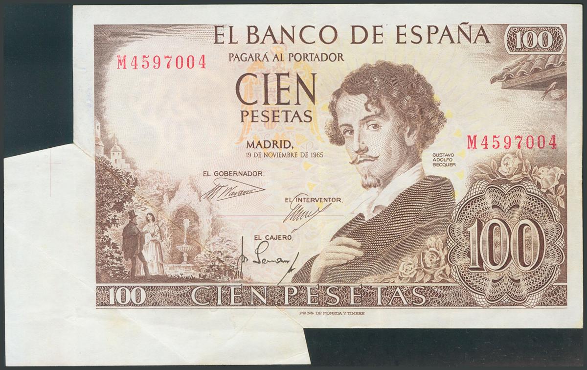 English 100 Pesetas. November 19, 1965. Series M. (Edifil 2017: 470a). Spectacular and impressive guillotined failure. AU.