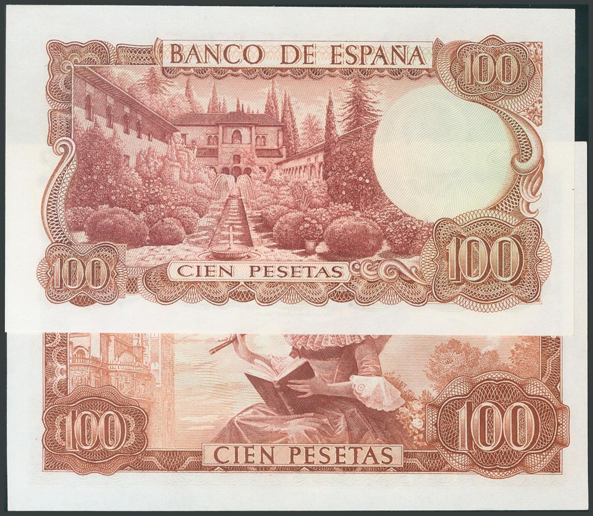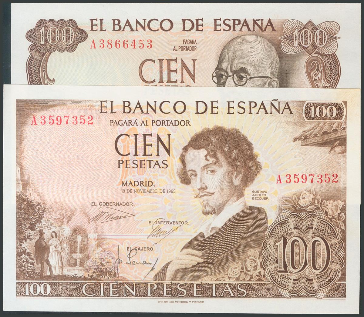 Set of 2 banknotes of 100 Pesetas, issued on November 19, 1965 and November 17, 1970, respectively and both series A. (Edifil 2017: 470a, 472a). Both with original sizing. UNC/ UNC.