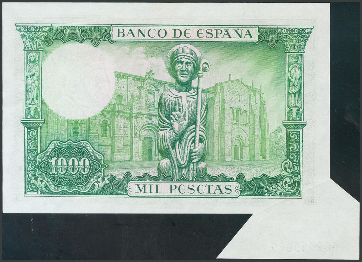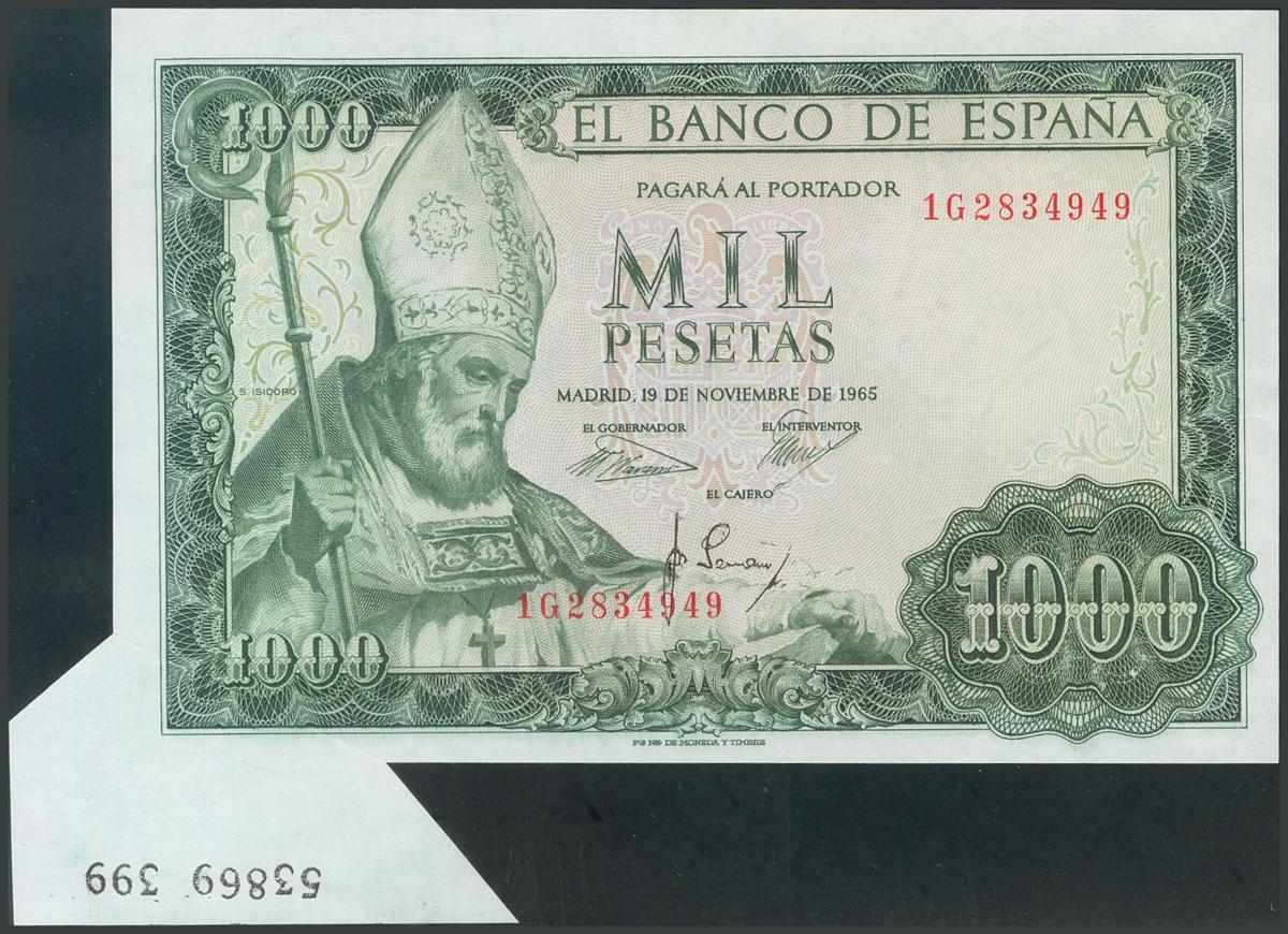 1000 Pesetas. November 19, 1965. Cutting error. 1G series. (Edifil 2017: 471b). Original and spectacular sizing and very rare as well. UNC.