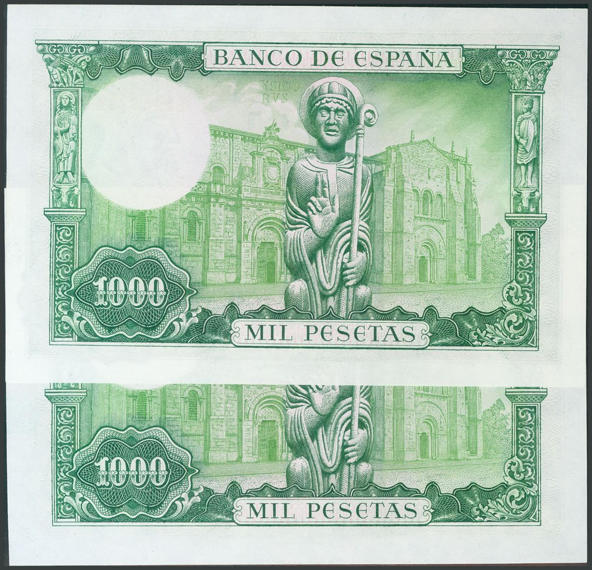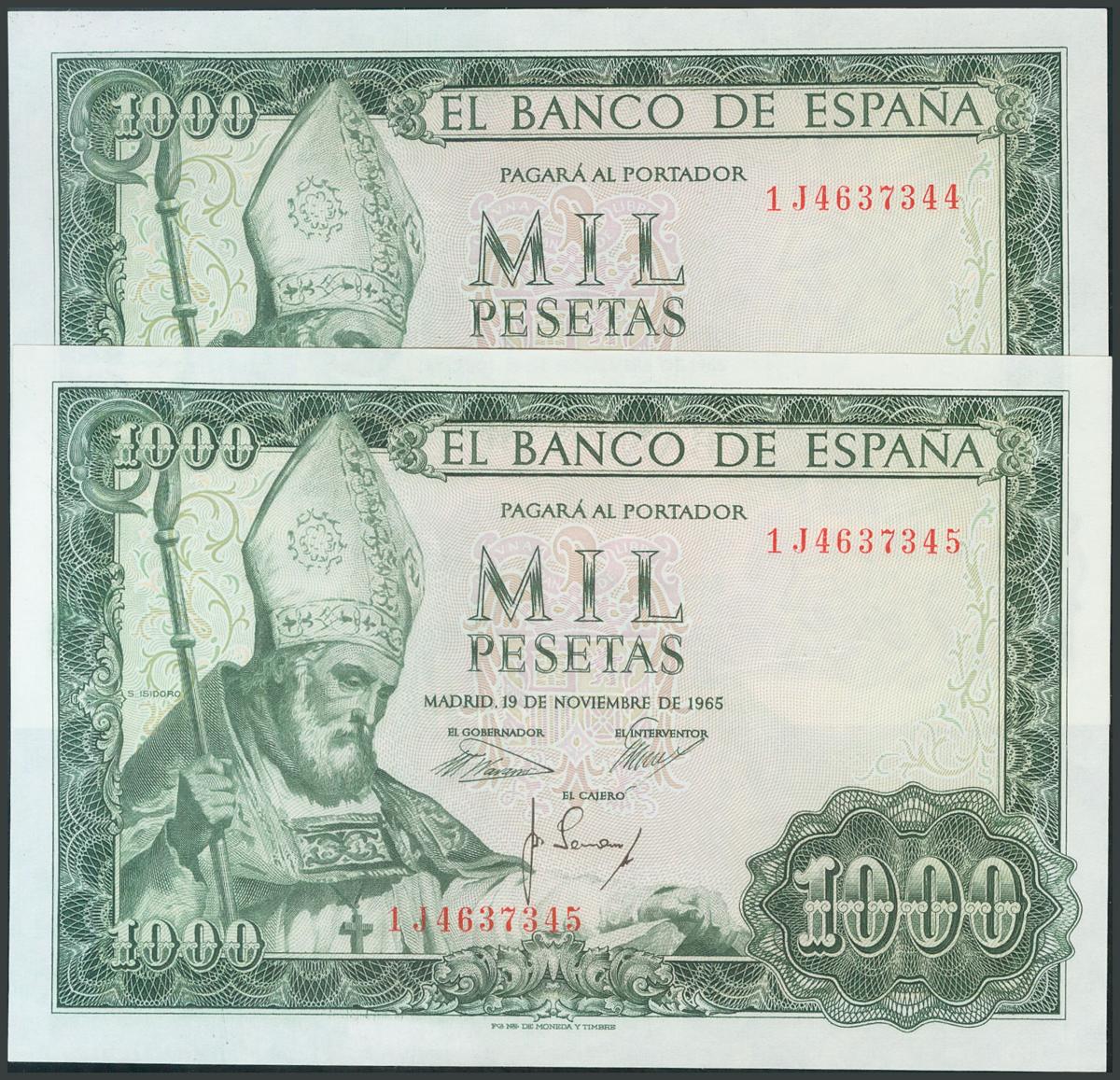 1000 Pesetas. November 19, 1965. Correlative couple. Series 1J. (Edifil 2017: 471b). Original sizing. UNC.