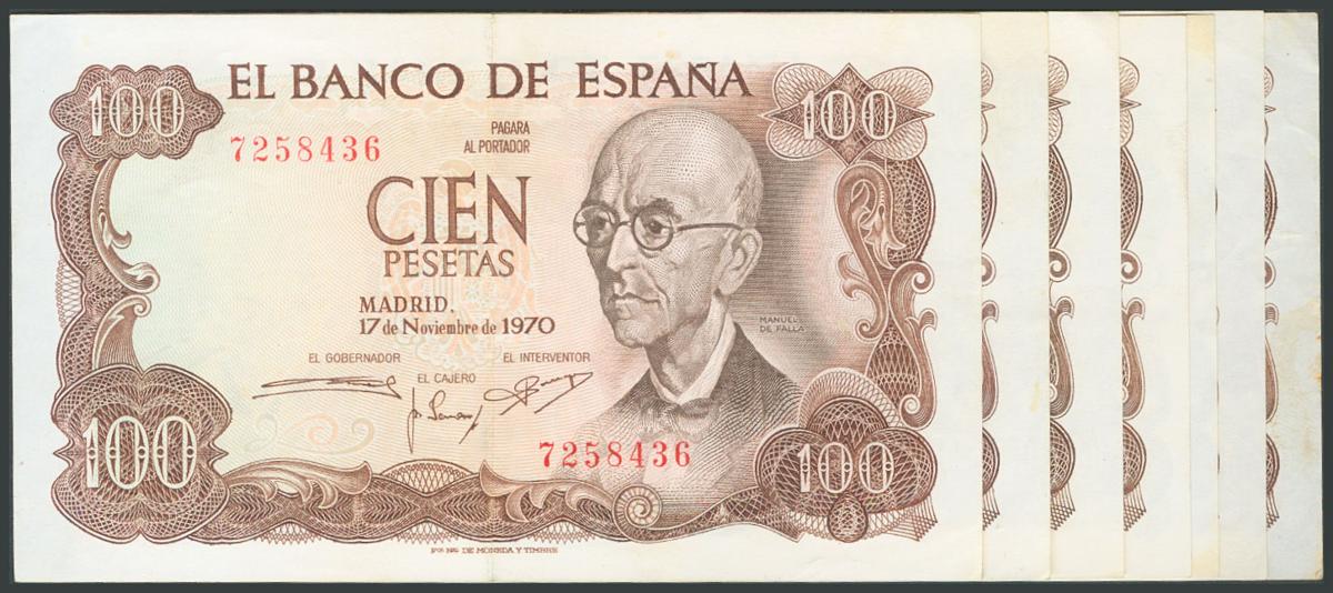 Set of 7 banknotes of 100 Pesetas issued on November 17, 1970, without series (3) and with series B (2), C and R. (Edifil 2017: 472, 472b). AU/ F.