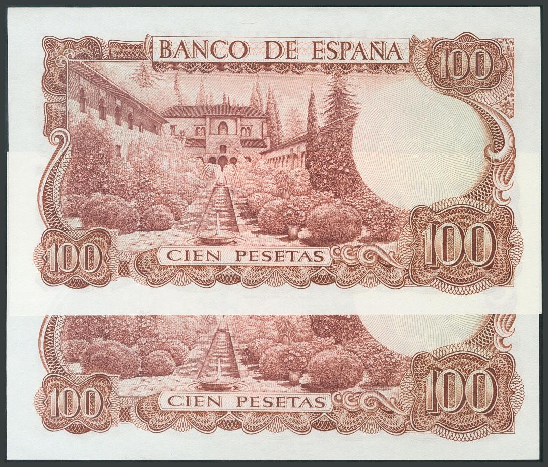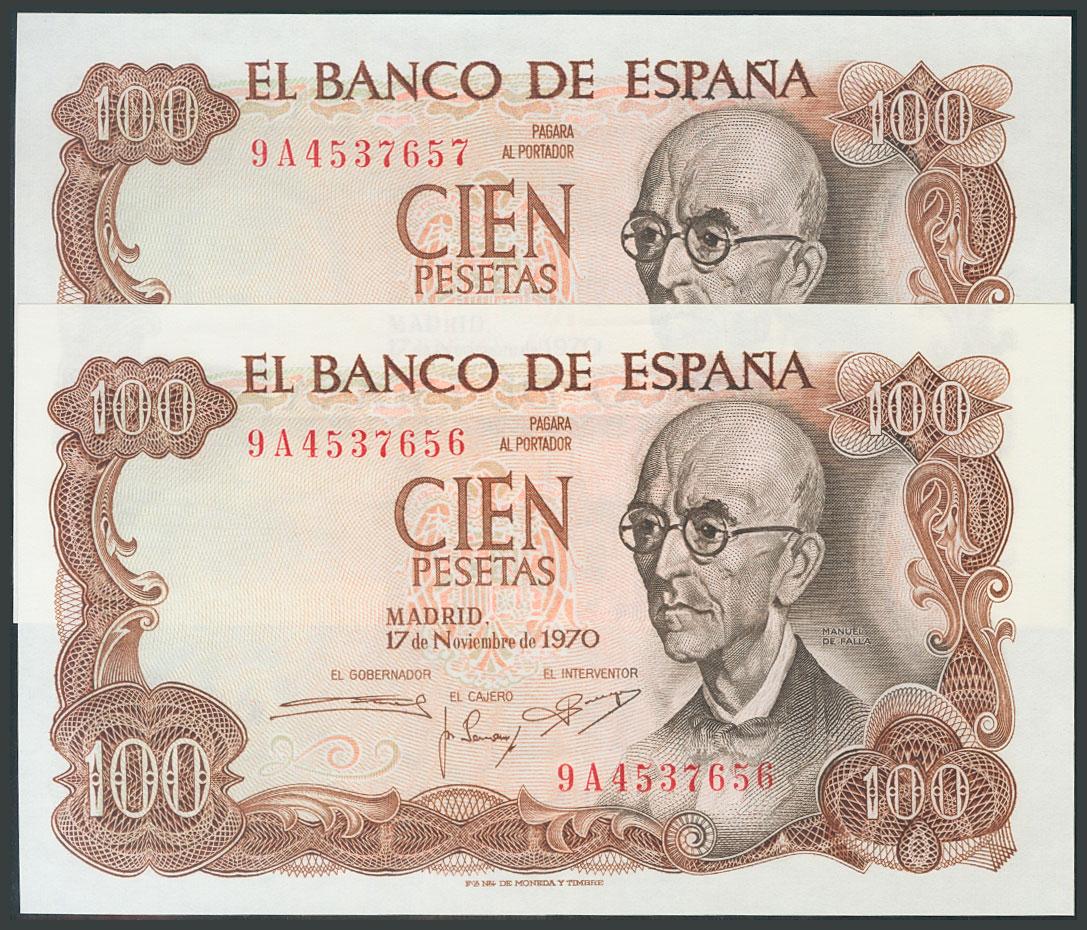 100 Pesetas. November 17, 1970. Correlative pair. 9A special series. (Edifil 2017: 472a). UNC.