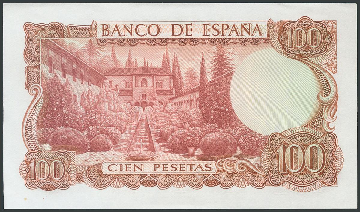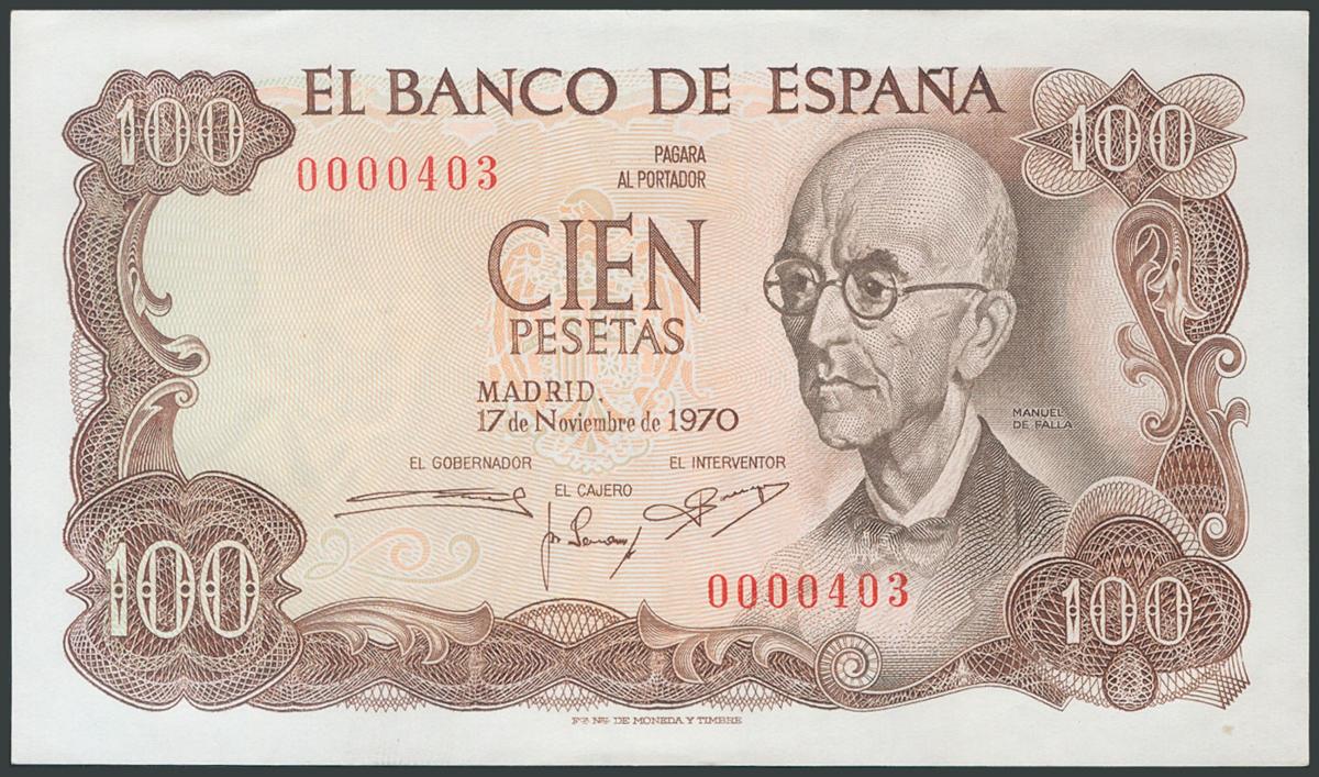 100 Pesetas. November 17, 1970. No series and very low numbering. (Edifil 2017: 472). UNC.