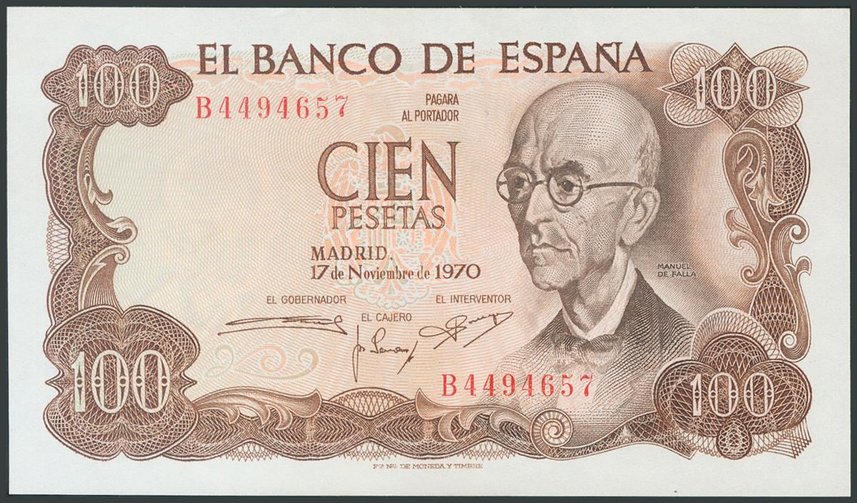 100 Pesetas. November 17, 1970. Series B. (Edifil 2017: 472b). Original sizing. UNC.