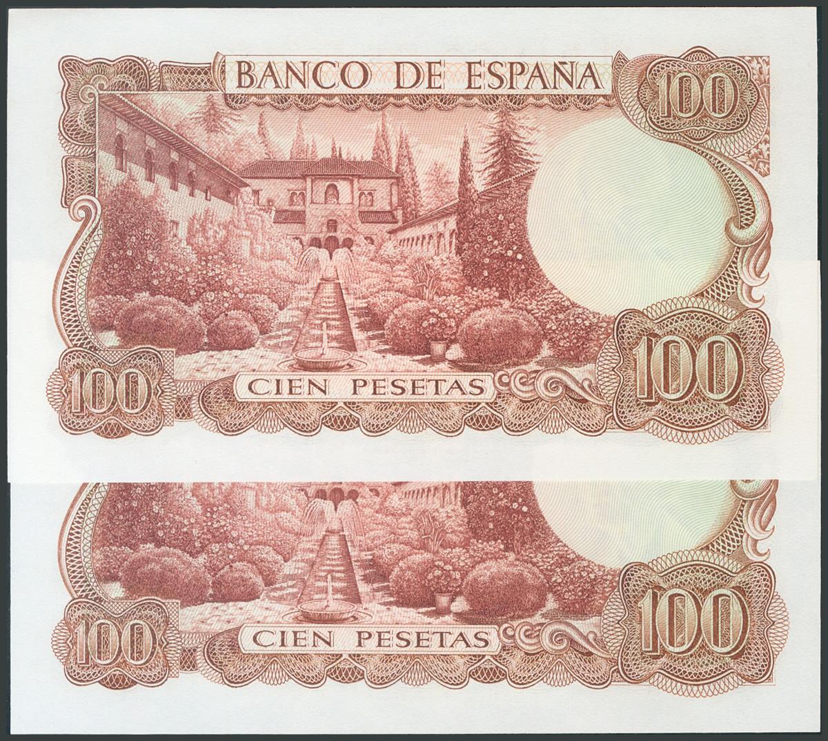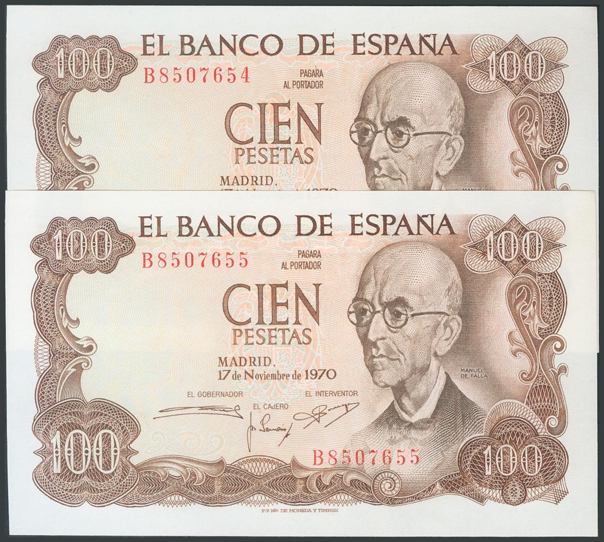 English 100 Pesetas. November 17, 1970. Correlative pair. Series B. (Edifil 2017: 472b). Original sizing. UNC.
