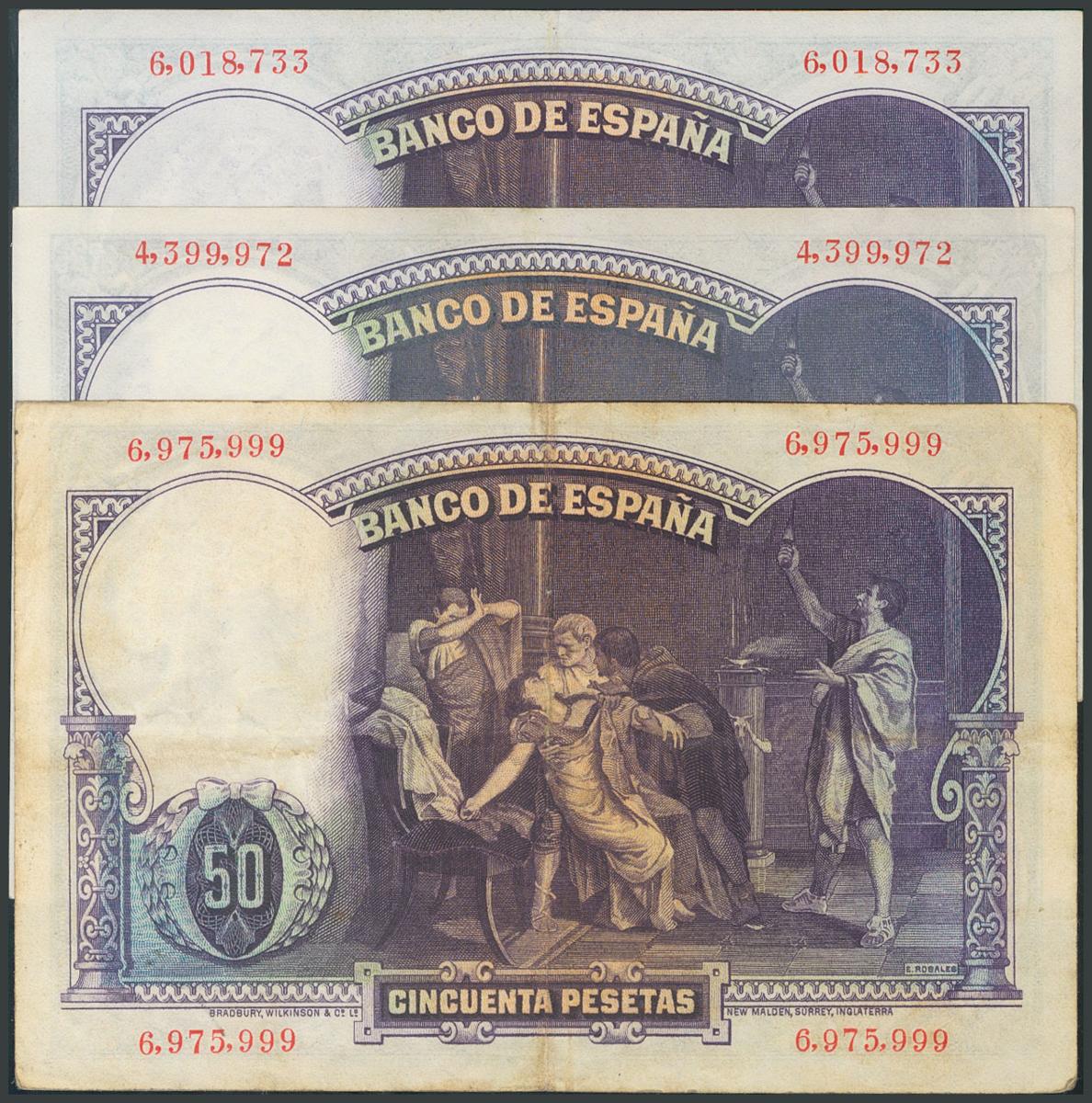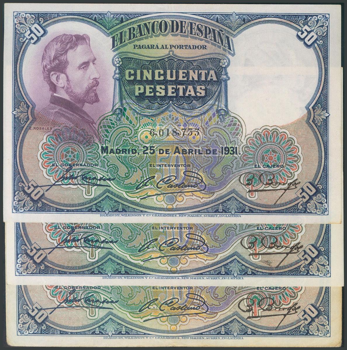 Set of 3 50 Pesetas banknotes issued on April 25, 1931. Without series. (Edifil 2017: 359), two of them with part of original sizing. AU/ F.