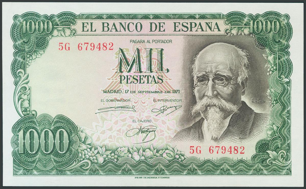 1000 Pesetas. September 17, 1971. 5G Series. (Edifil 2017: 474c). Original sizing. UNC.