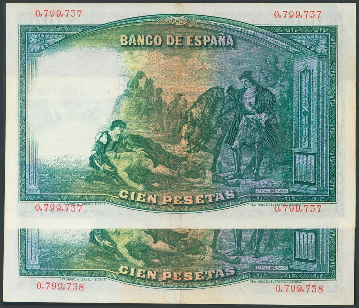English 100 Pesetas. April 25, 1931. Correlative couple. No serie. (Edifil 2017: 360). Original sizing and slight moisture stains. XF.