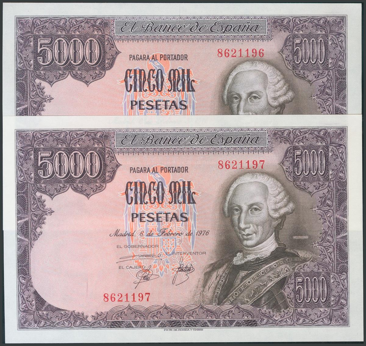 5000 Pesetas. February 6, 1976. Correlative pair. No serie. (Edifil 2017: 475). Original sizing. UNC.