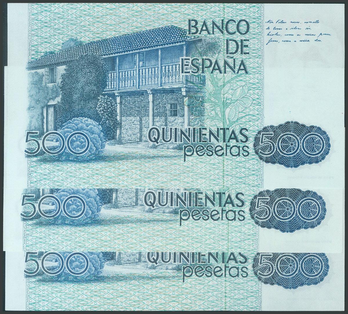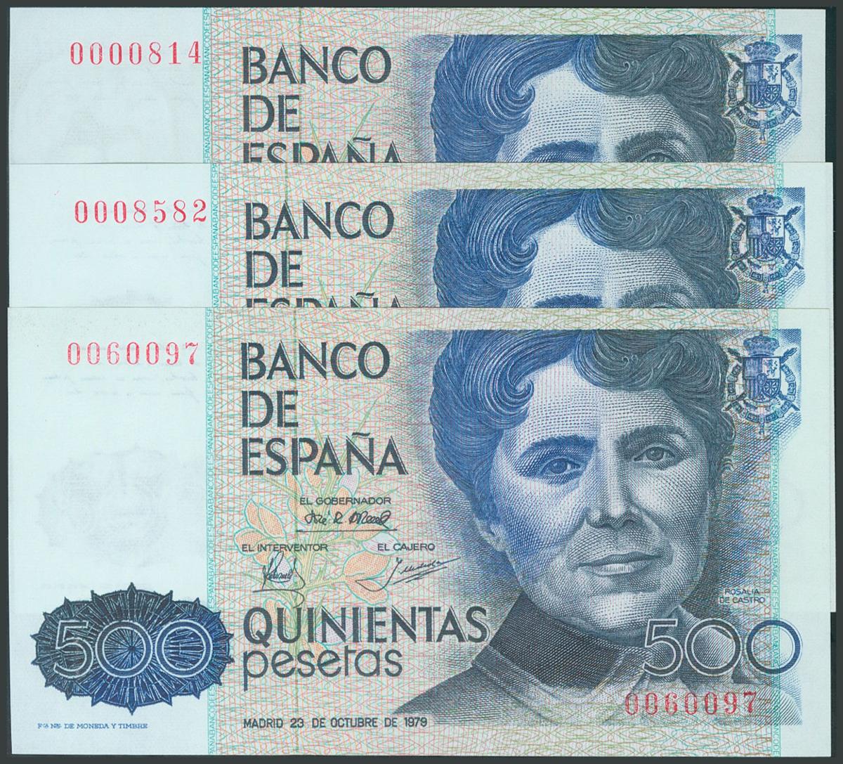 500 pesetas. October 23, 1979. Three banknotes without series and with numbers starting with 00, 000 and 0000. (Edifil 2017: 476). UNC.