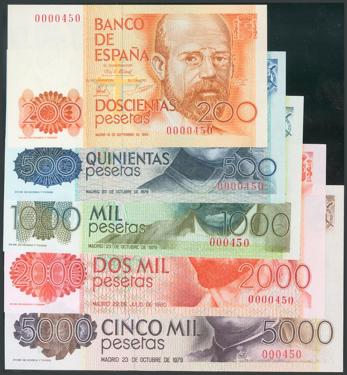 Complete set of 5 banknotes corresponding to the values of 200 Pesetas, 500 Pesetas, 1000 Pesetas, 2000 Pesetas and 5000 Pesetas, issued between December 23, 1979 and July 22, 1980, all of them with the same low number 0000450. ( Edifil 2017: 480, 476, 477, 479, 478). Very rare set including the 5000 Pesetas and corresponding to the combination mentioned in the catalog. UNC.