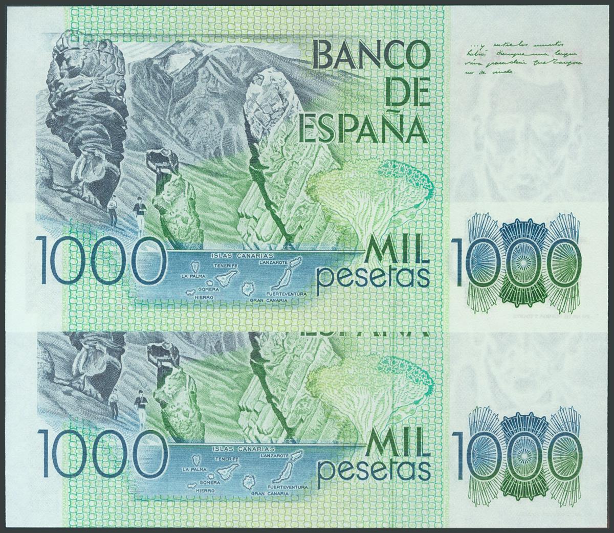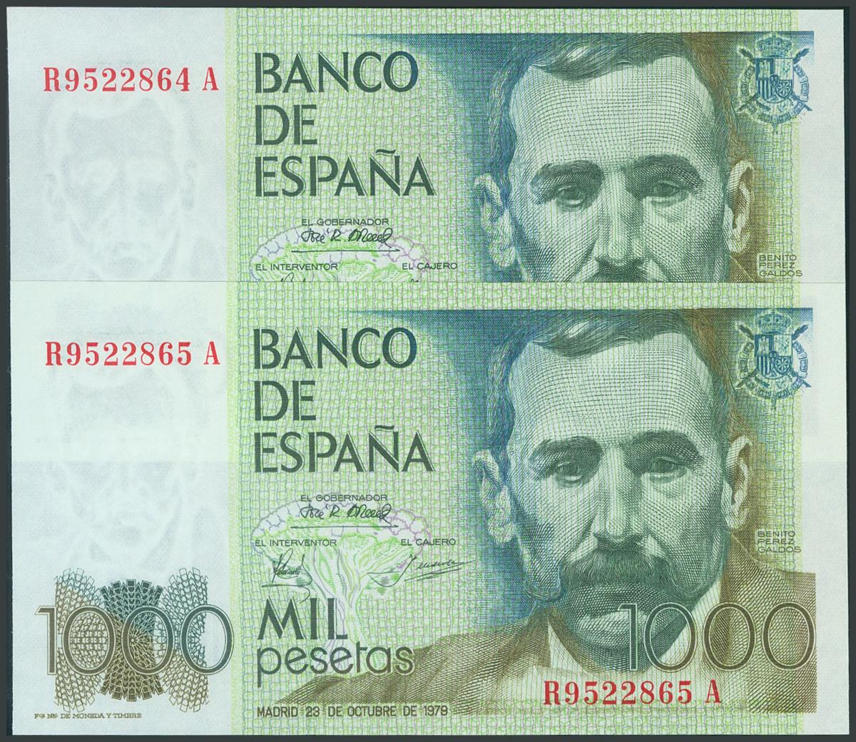 1000 Pesetas. October 23, 1979. Correlative couple. RA series. (Edifil 2017: 477a). UNC.