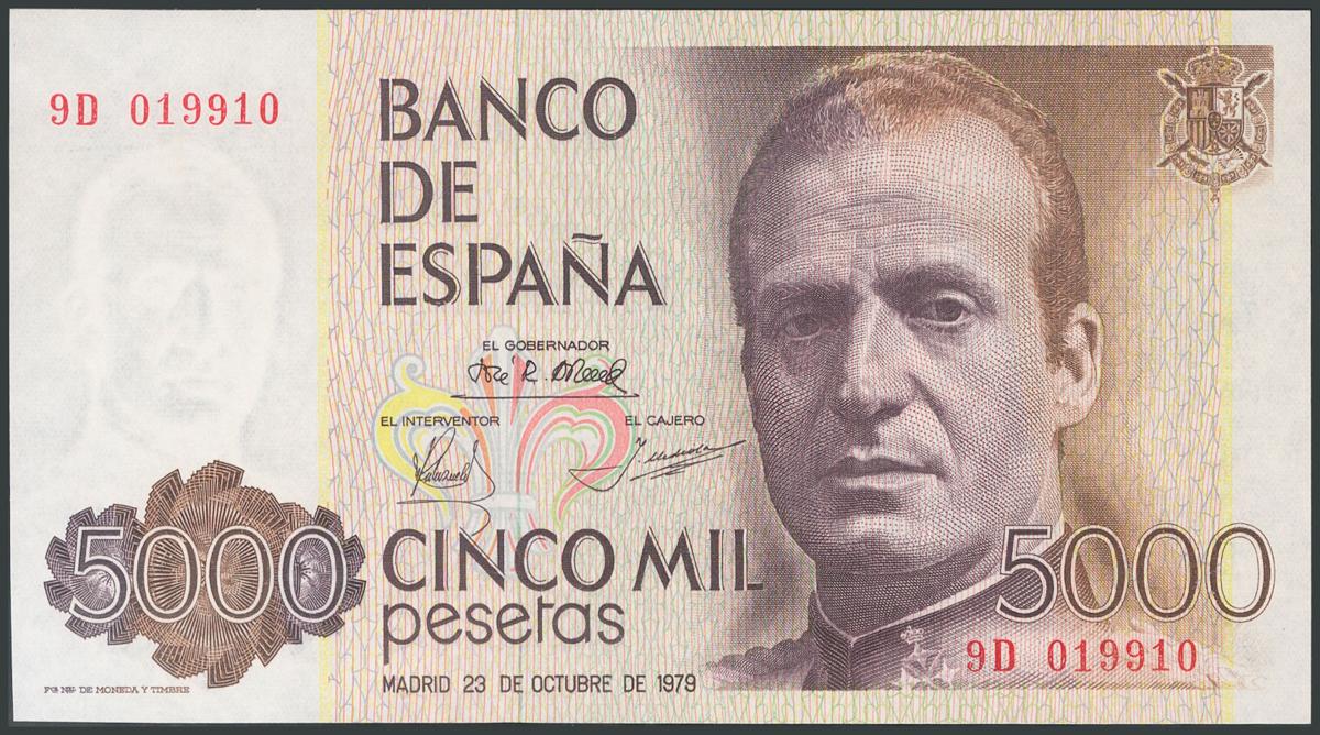 5000 Pesetas. October 23, 1979. Series 9D, special numbering and capicúa. (Edifil 2017: 478b). Unusual UNC.