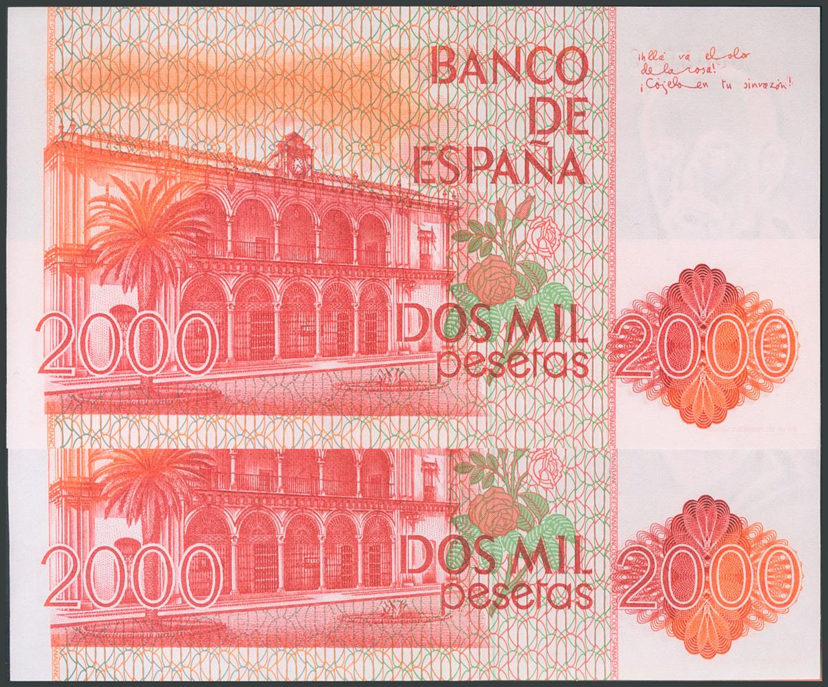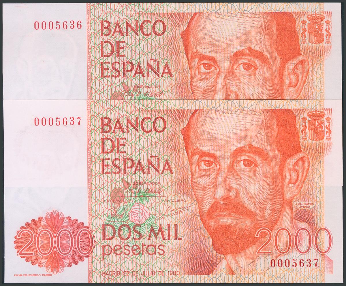 2000 Pesetas. July 22, 1980. Correlative pair. No series and very low numbering. (Edifil 2017: 479). UNC.