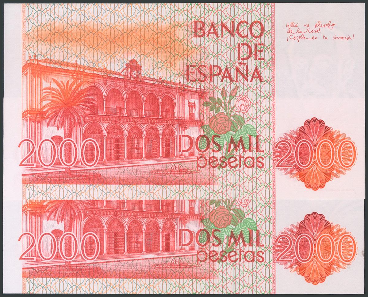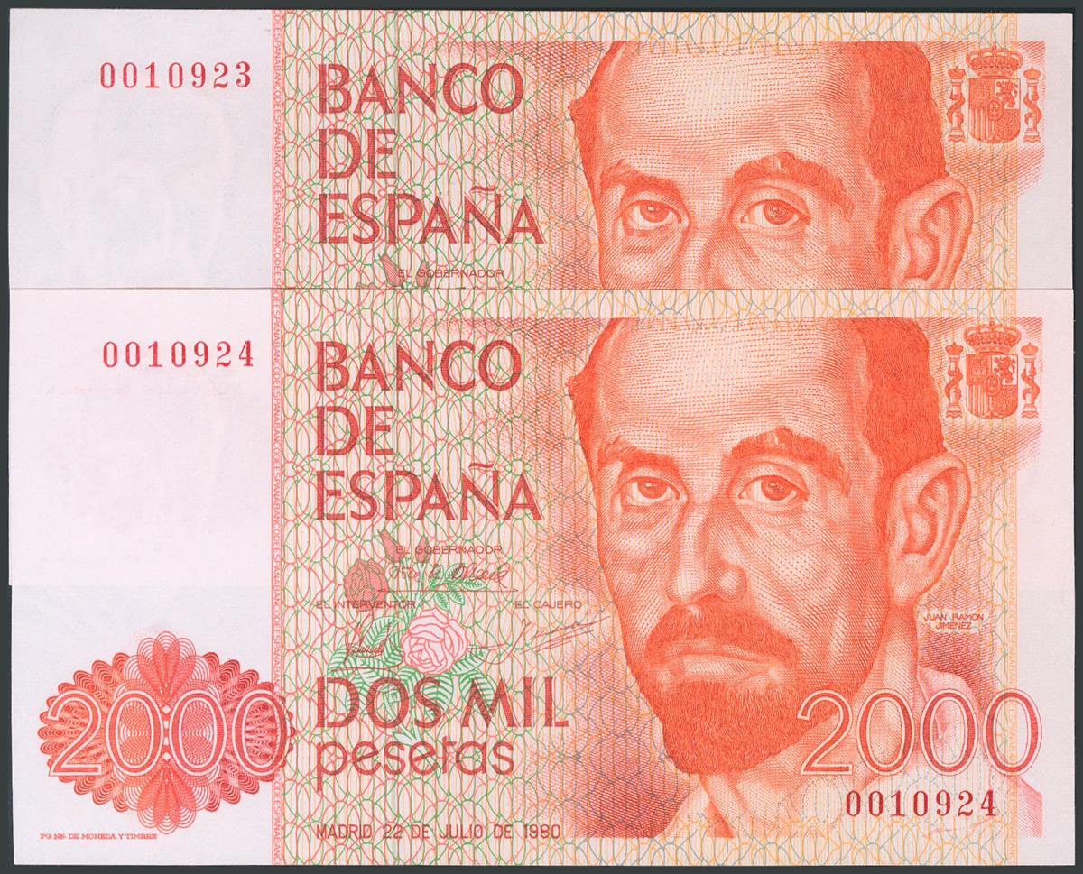2000 Pesetas. July 22, 1980. Correlative pair. No series and very low numbering. (Edifil 2017: 479). UNC.