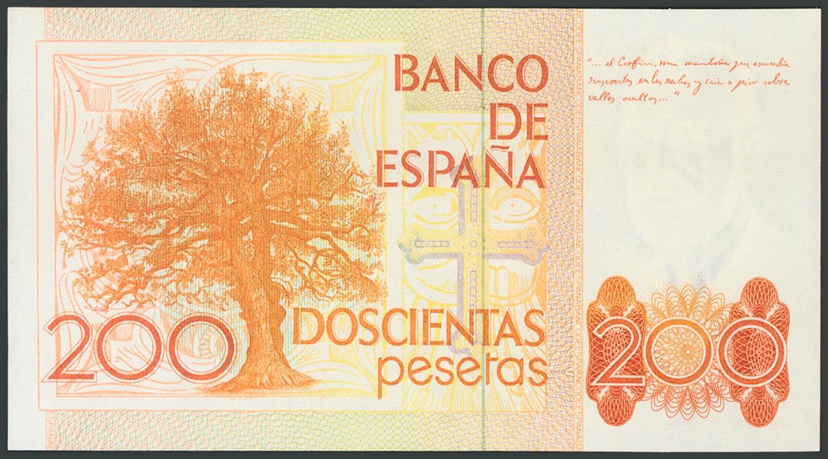 200 pesetas. September 16, 1980. Correlative pair. No series and very low numbering. (Edifil 2017: 480). UNC.